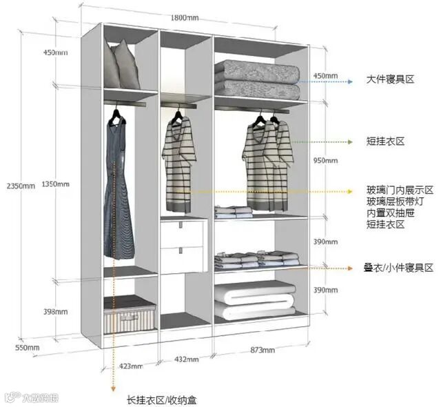 衣柜内部空间设计是否好,决定了你家衣柜收纳能力。在定制前建议对家里衣物梳理一遍,根据自家情况设计长衣区、短衣区、抽屉、格子抽等配件。