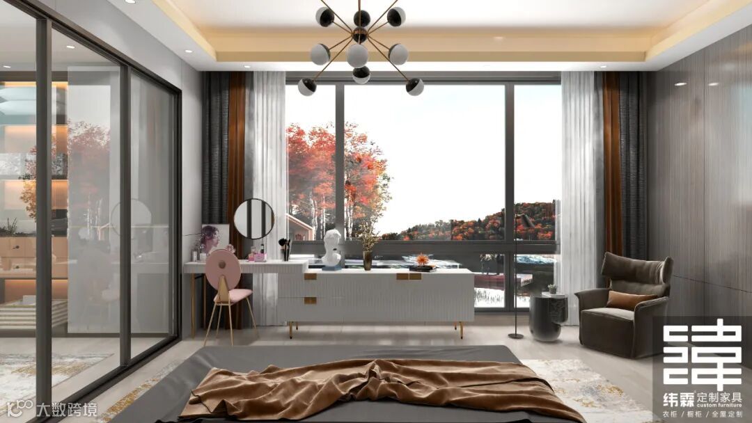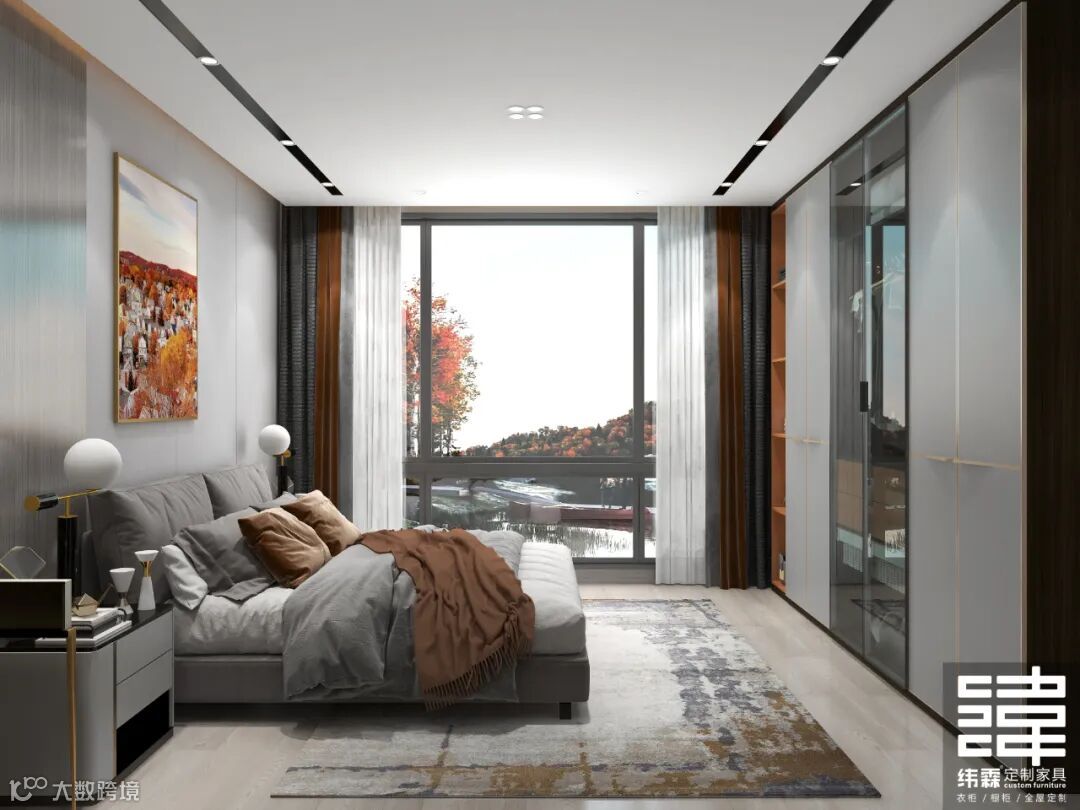 主卧空间很大,设计了一个衣帽间,主卧也有一个很大的落地窗,简洁的设计,大气,奢华轻奢!