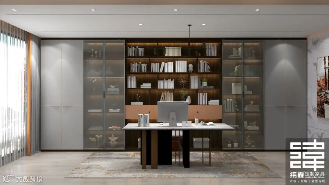 书房设计很简单,只有整面墙的柜子+个性书桌,柜子设计玻璃门+灯带做点缀