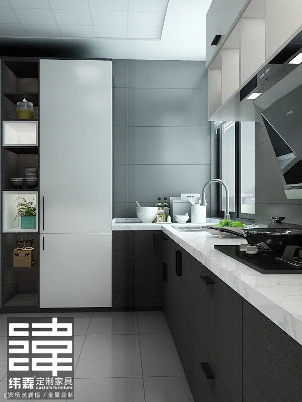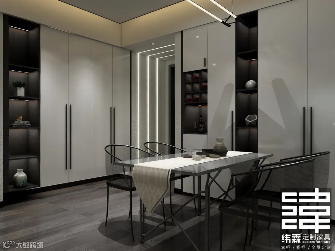 业主喜欢黑白灰暗色调装修,经过讨论,选择了落雨胡桃颜色做柜身颜色,白色门板做点缀,整体颜色不会很黑,经典耐看;全屋都采用了这个颜色,非常的协调完美!