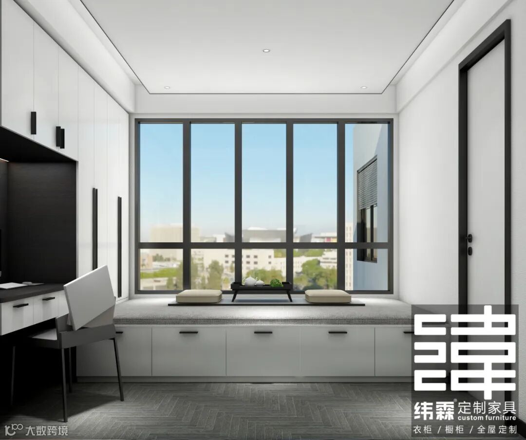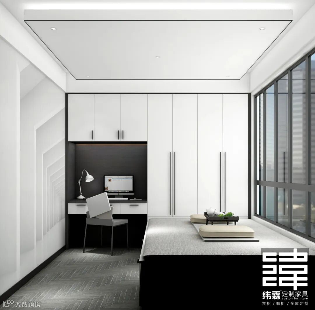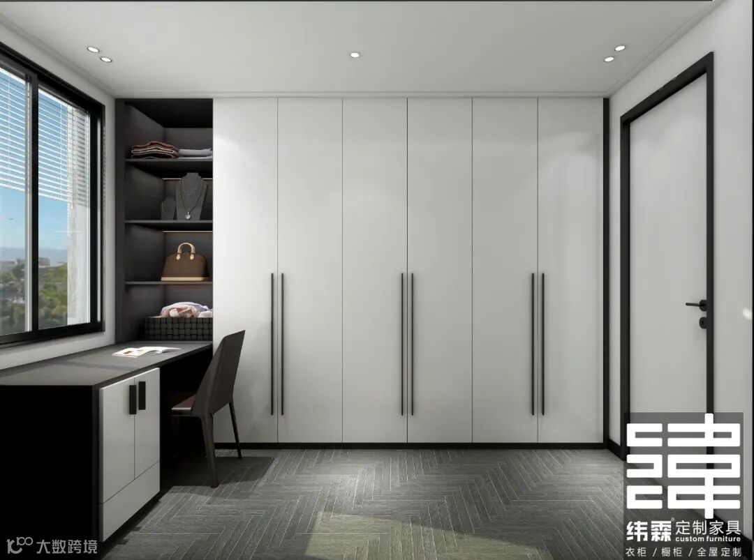 主卧里面设计了一个衣帽间,说是衣帽间其实也可以说一个个人空间,里面设计了一个书桌,一个衣柜,男主平时办公或者玩游戏都是一个不错的选择!