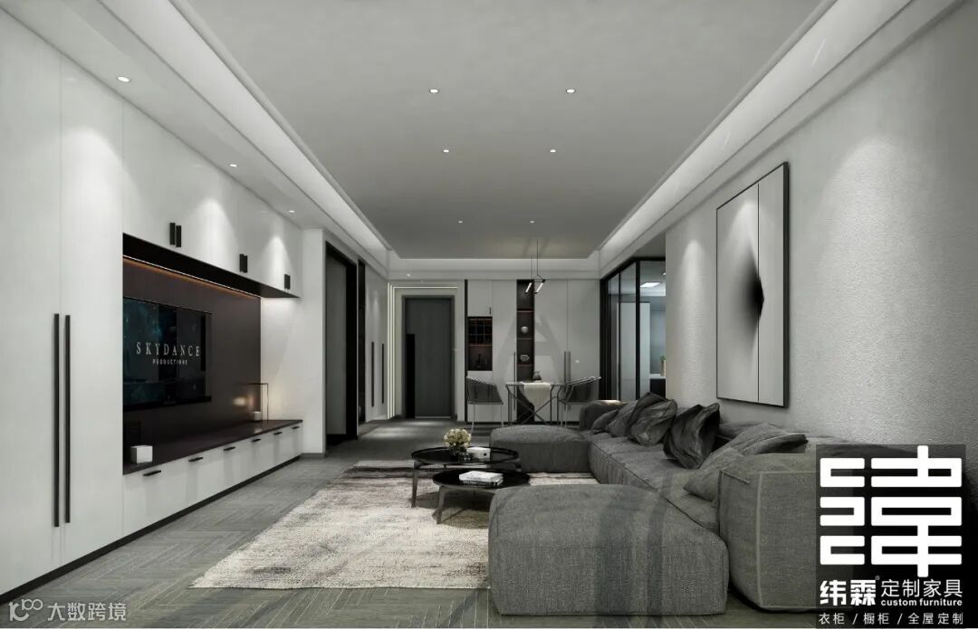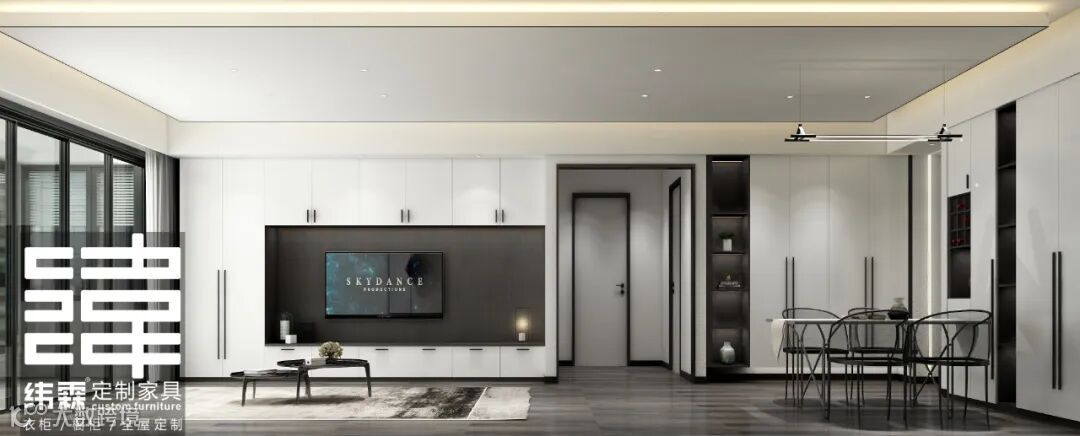 客厅采用大面积平吊加无主灯设计,磁吸轨道灯增加空间灯光氛围。