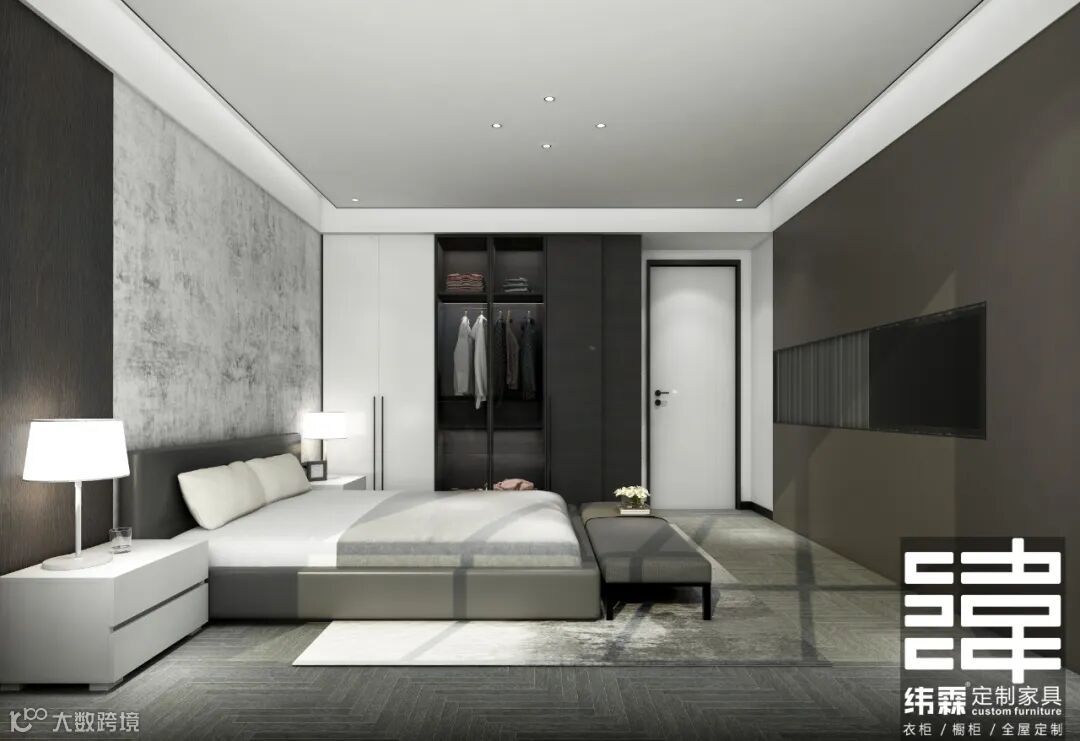 主卧空间足够大,床尾到墙面的空间还很大,设计师给其设计了一整面的柜子,可以放置电视柜,还有一个大大的储物柜,开放格还放置了灯带,很完美!