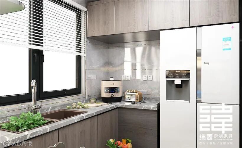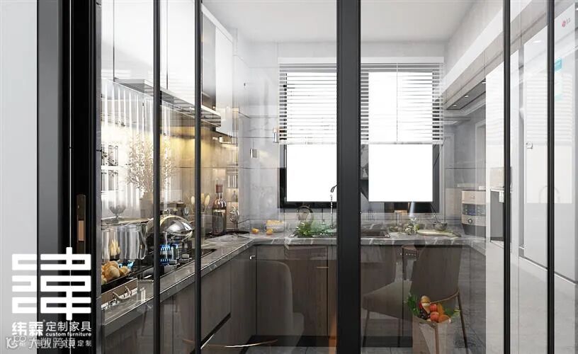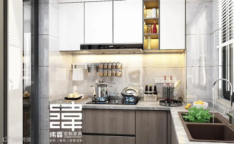 厨房空间看着就是挺小的一个U型厨房,但是设计师巧妙的把厨电都安排好了,收纳吊柜足够把家里的瓶瓶罐罐收纳好,同时也使双门冰箱有了容身之处。