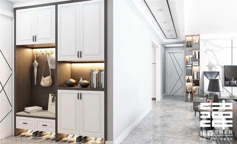入门鞋柜,有足够多的空间满足业主各式鞋子的收纳需求。换鞋凳、个性挂钩的设置,让日常居家生活更方便。