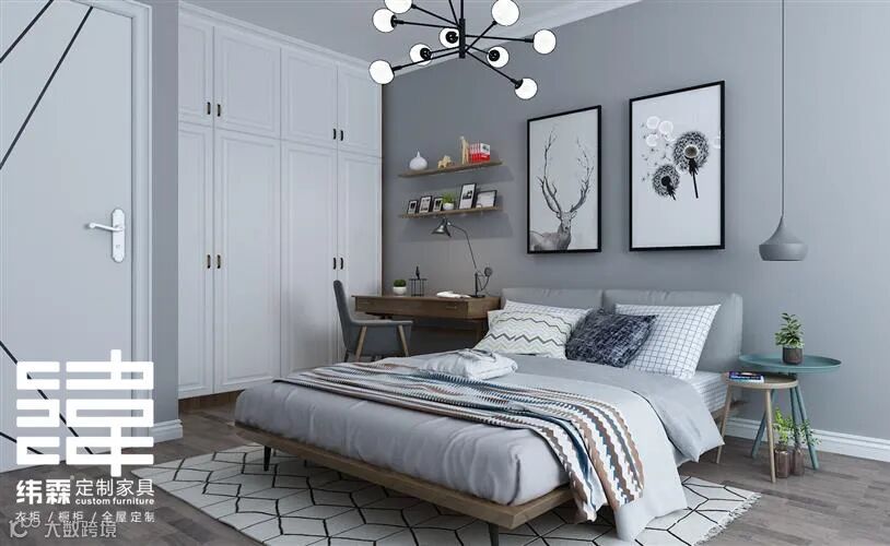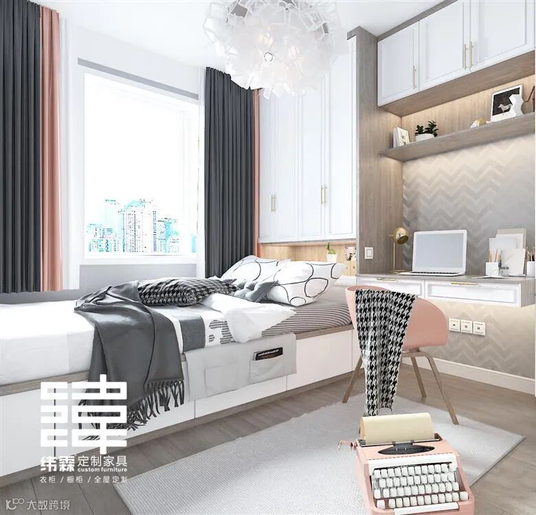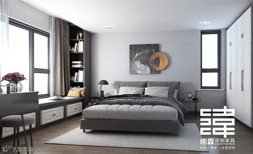 主卧空间比较大,设计师给其设计了一个飘窗柜,飘窗柜左边放置了书桌+化妆台一起,右边设计了一个书柜,巧妙的利用了空间;