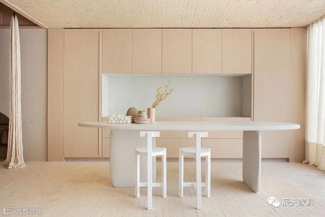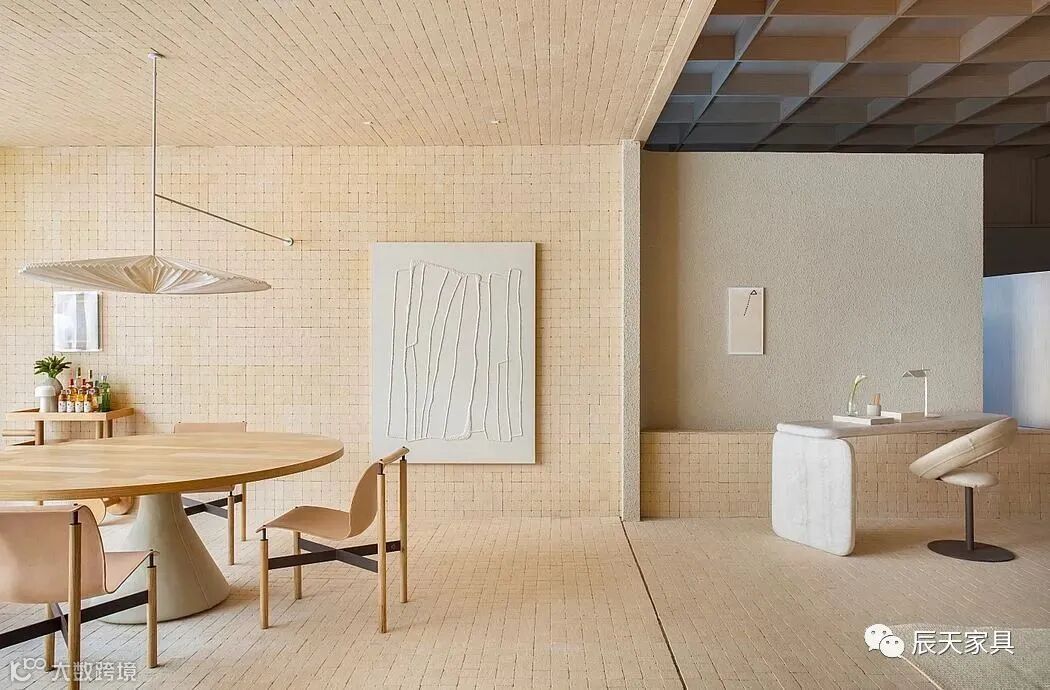 室内装潢、书柜、镜子等其他家具都采用了圆形的元素,整体环境是中性色调,构成了空间的现代简约风格。天然材料广泛应用于餐厅、家庭办公室、厨房和带浴室的套房。