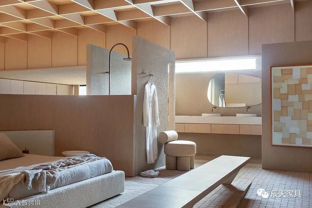 进入套房,沿着坡道走,卧室的极简环境营造出温馨、轻盈的氛围,突出了设计师专为展览设计的床。紧挨着它的是具有体积感的浴室,结合其他房间构成了精致的外观。