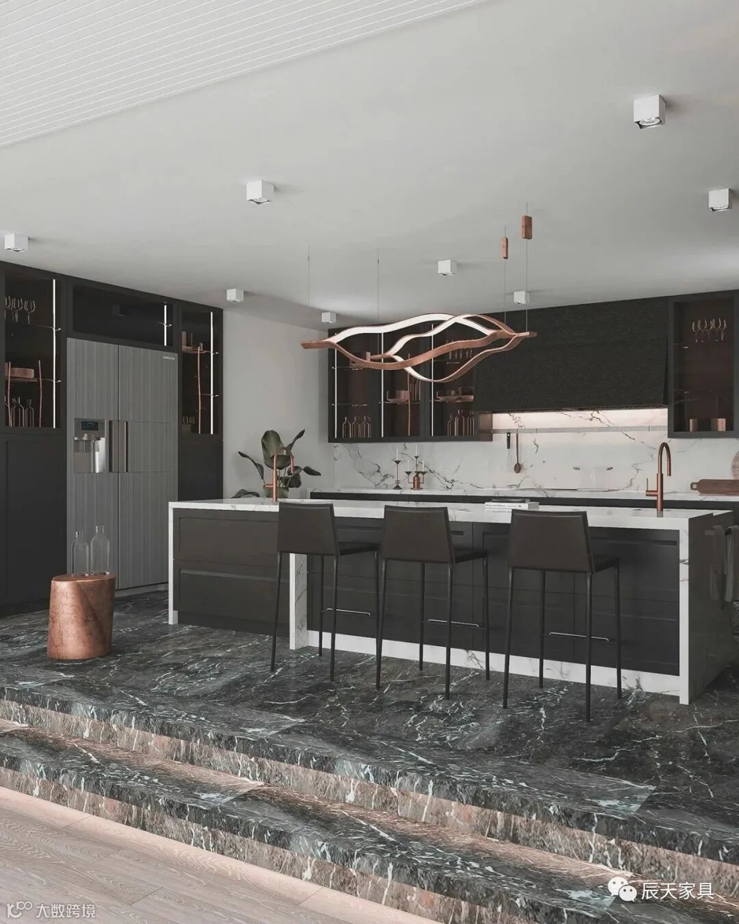厨房以白色为主,黑色为辅,也是空间的一种对比形式。让空间更加张弛有度。纯白的大理石台面从黑色中脱颖而出,金色的吊灯与各个装置在凸显空间的现代气息,丰富整体层次。