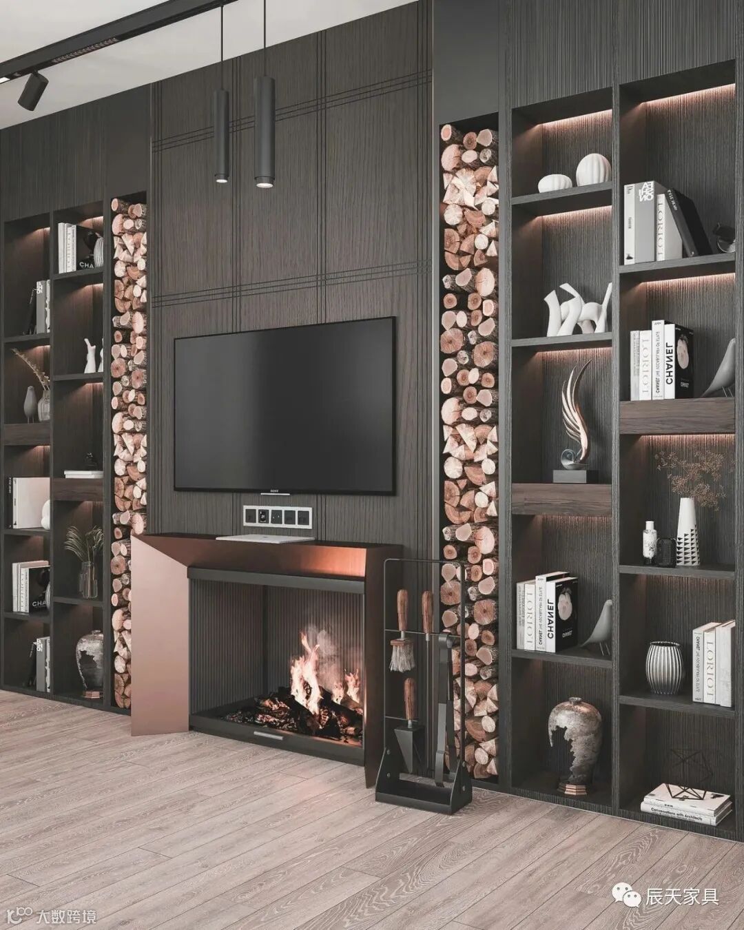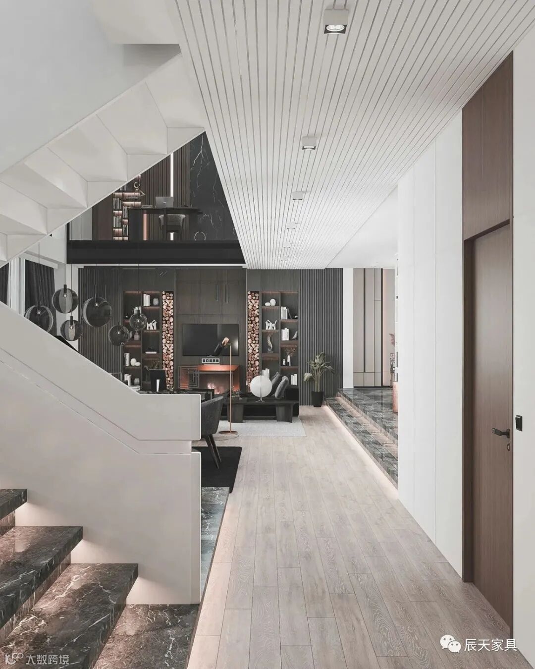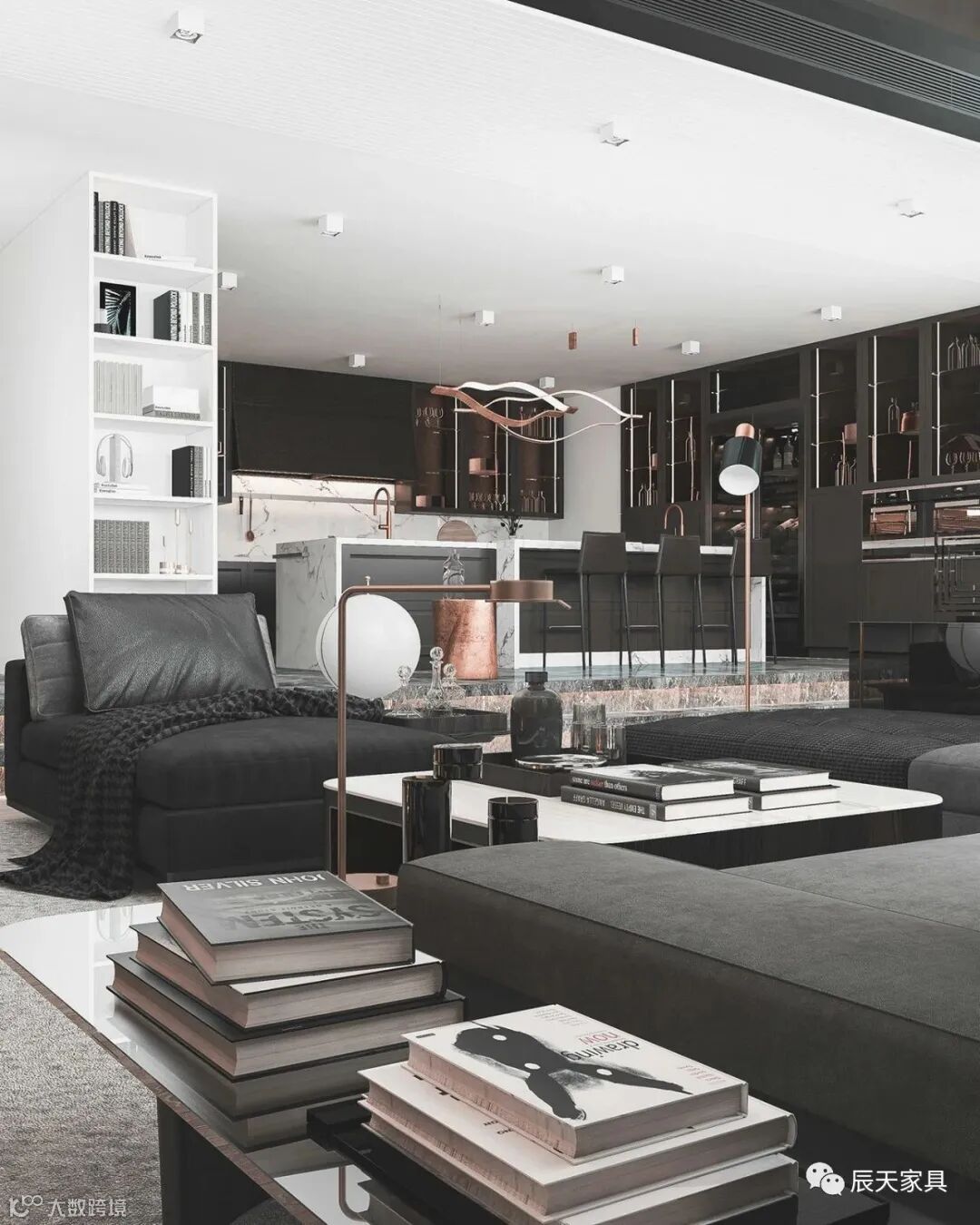 室内空间较为宽敞,开放式的客厅拥有较高的空间,这也是空间附有一定的通透感。黑色的沙发强调理性与内敛,稳重而随性,赋予都是生活的精致感与沉稳。