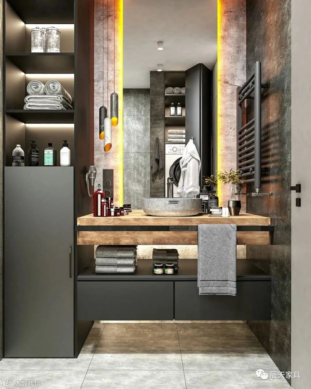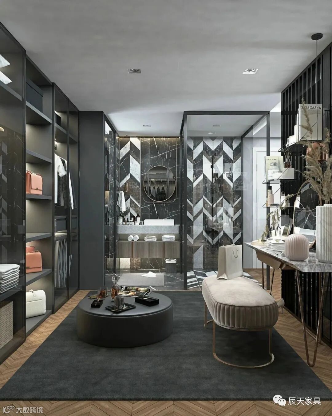 工作区域与更衣区被划开,简单地组合才能让人专注于工作。透明玻璃的浴室让空间更加通透,宽敞。