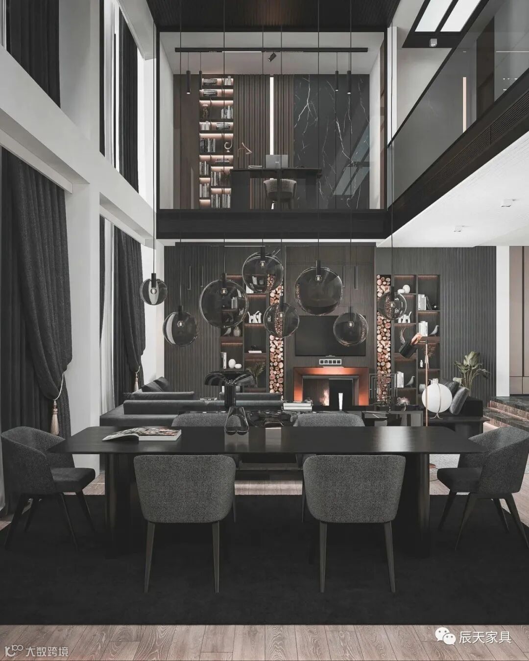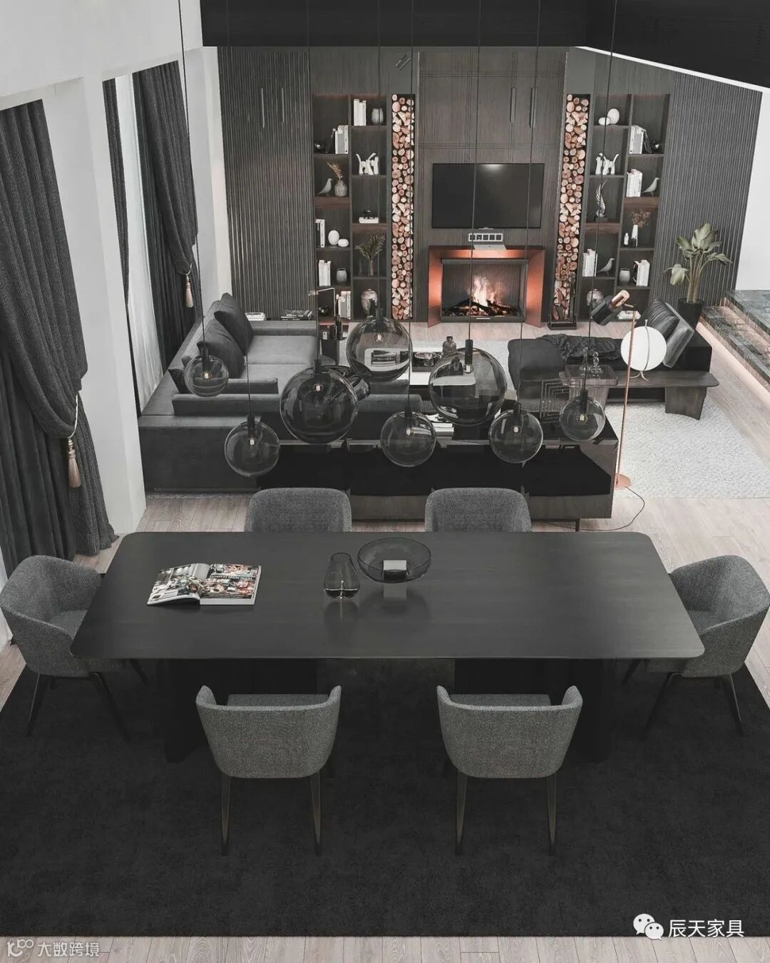 黑色透明的吊灯带来轻盈通透的视觉体验,融入空间的黑色餐桌餐椅散发着神秘与静谧的气息,多扇窗户引入充足的光线,将黑色的不同材质一一展现。