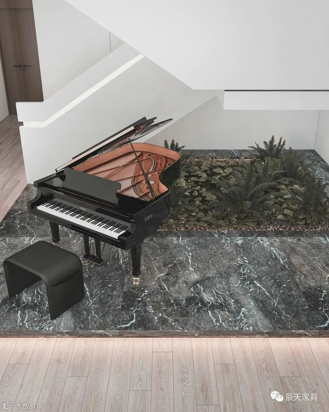 纯白的楼梯成为一个和谐的静止画面,楼梯下一坛梦幻绿植配上黑色钢琴,搭建成和谐、静谧的意境美。