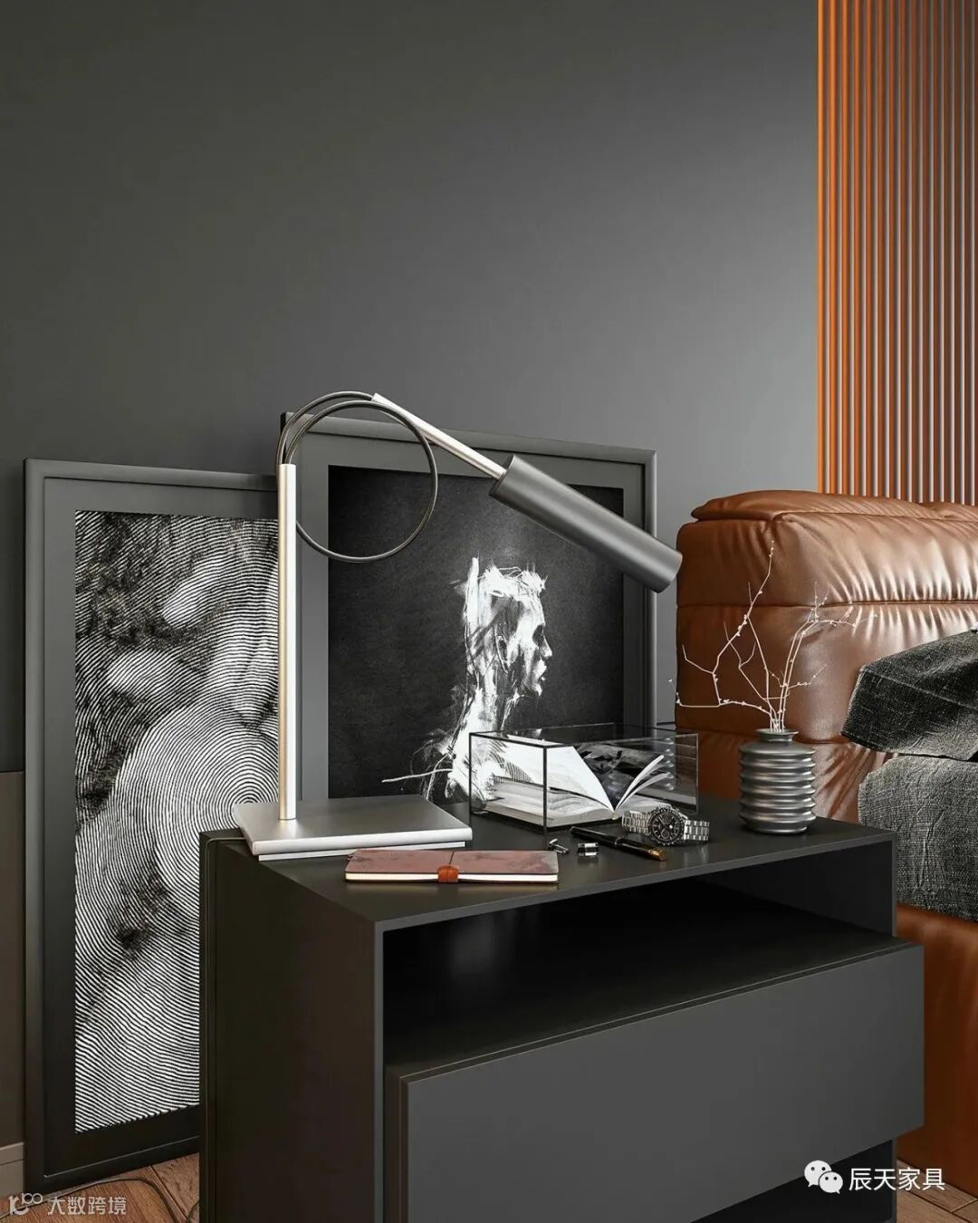 主卧容纳更衣室、工作台、梳妆区与浴室。首先是独特的背景墙带来的高级感与艺术气息,将空间的格调升华,柔软的地毯与床让人得到更大限度地放松。