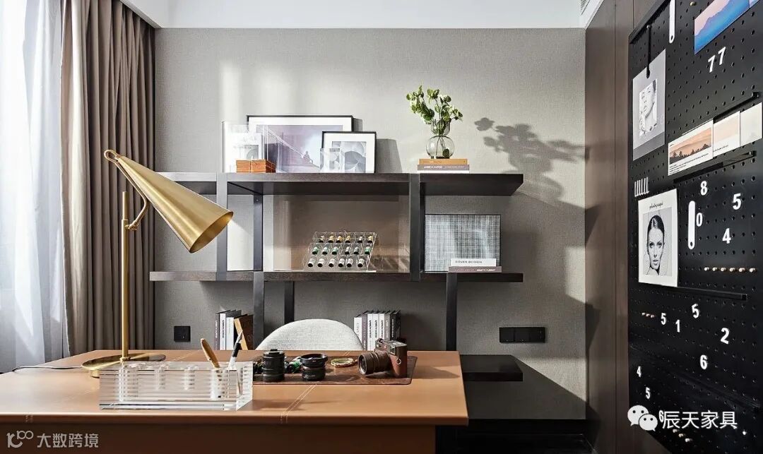 在这里,设计师预设的主人,是一位爱好摄影、自由不羁的艺术家。在木色与黑色拼接的工作台上,一盏造型别致的金属台灯,彰显着居者时尚优雅的审美品味,而一旁的洞洞板,可自由挂置照片或手记,既搭建起艺术化的生活方式,又蕴含着自由的精神内涵。