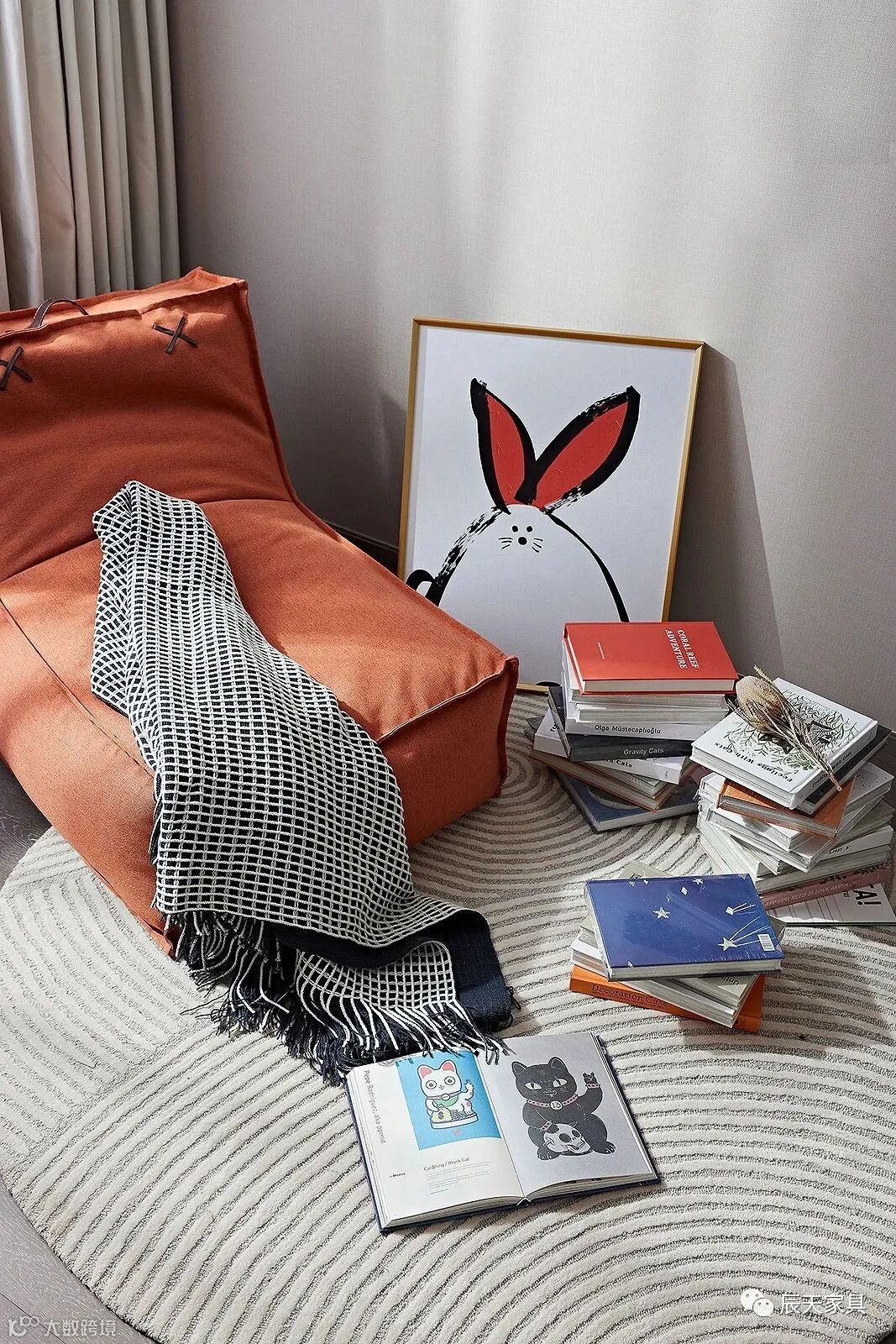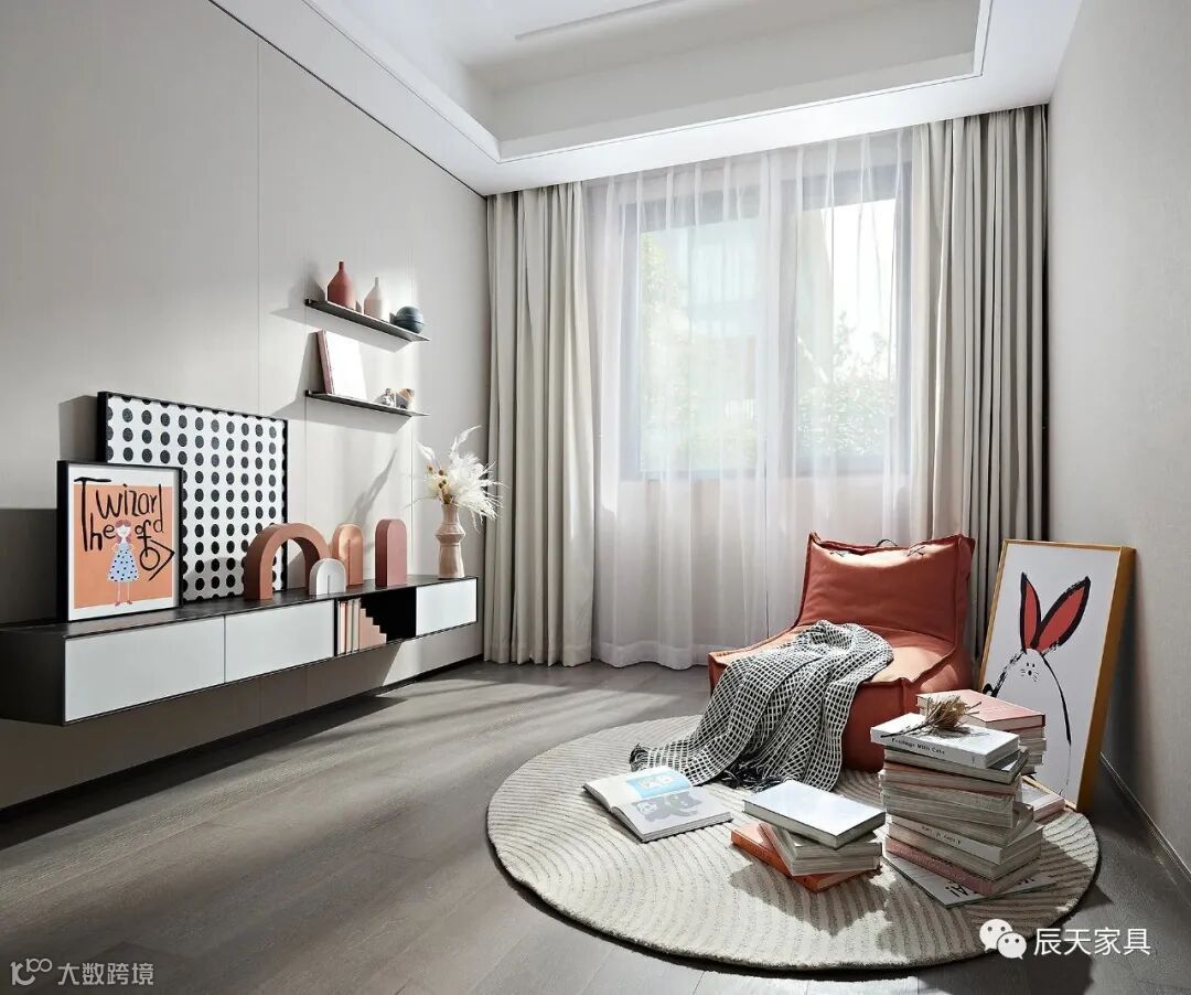设计运用形制各异的艺术摆件,与活泼可爱的卡通挂画,精心构置儿童房的有趣情境。一隅处的橘色单人沙发、圆形的纹路地毯,创造性地搭建了一个多变的场景,孩童可以在此安静阅读、玩耍嬉戏、休闲小憩,饱含生活趣味。