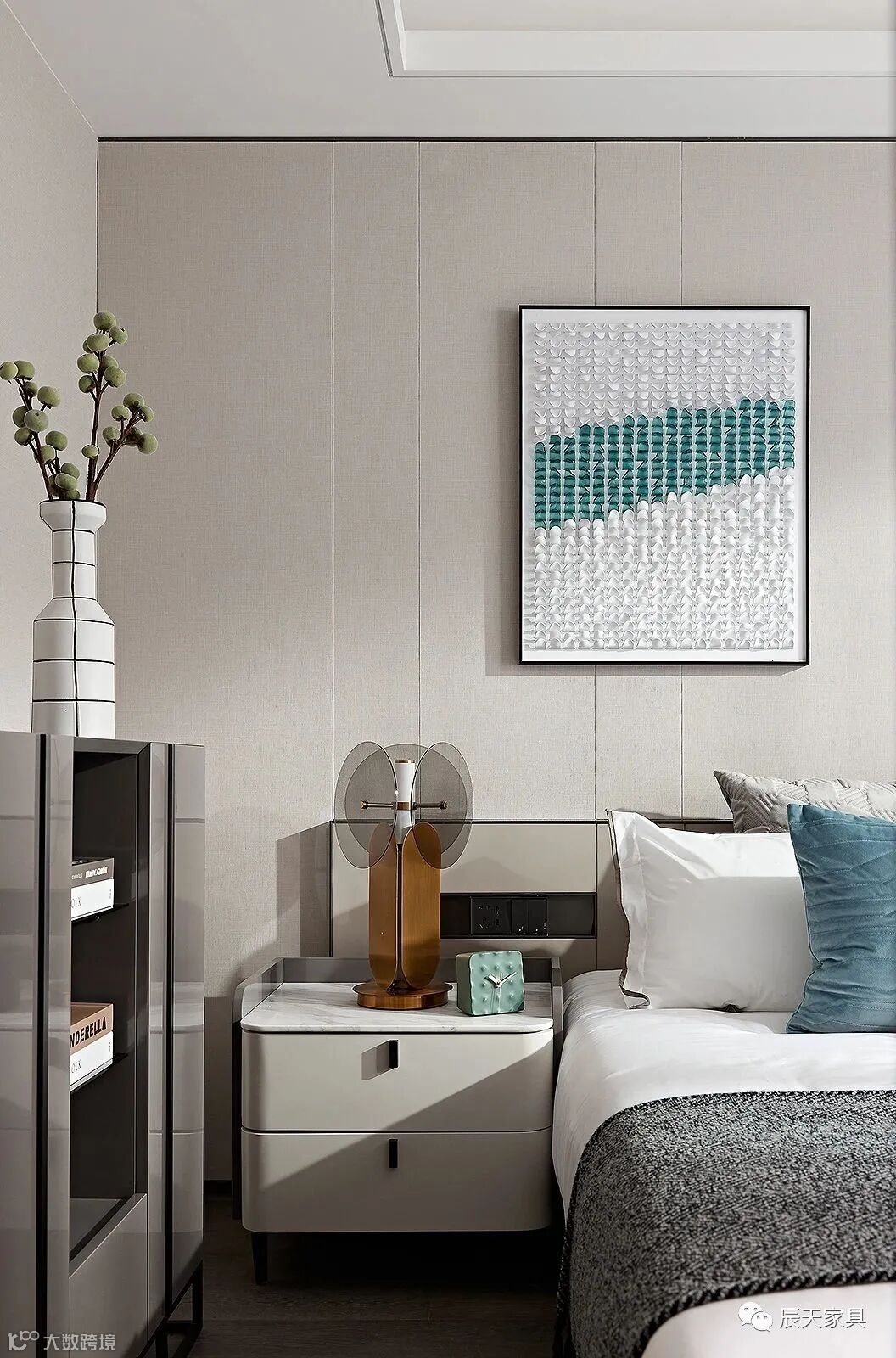 次卧空间的设计语言,谱写着简雅清透的气质格调。墙面挂画中的一抹湖绿,如水波般微微荡漾,与通透的亚克力台灯形成一个有趣的艺术组合。当阳光透过白色纱帘洒进空间,一切落得清幽而静雅。