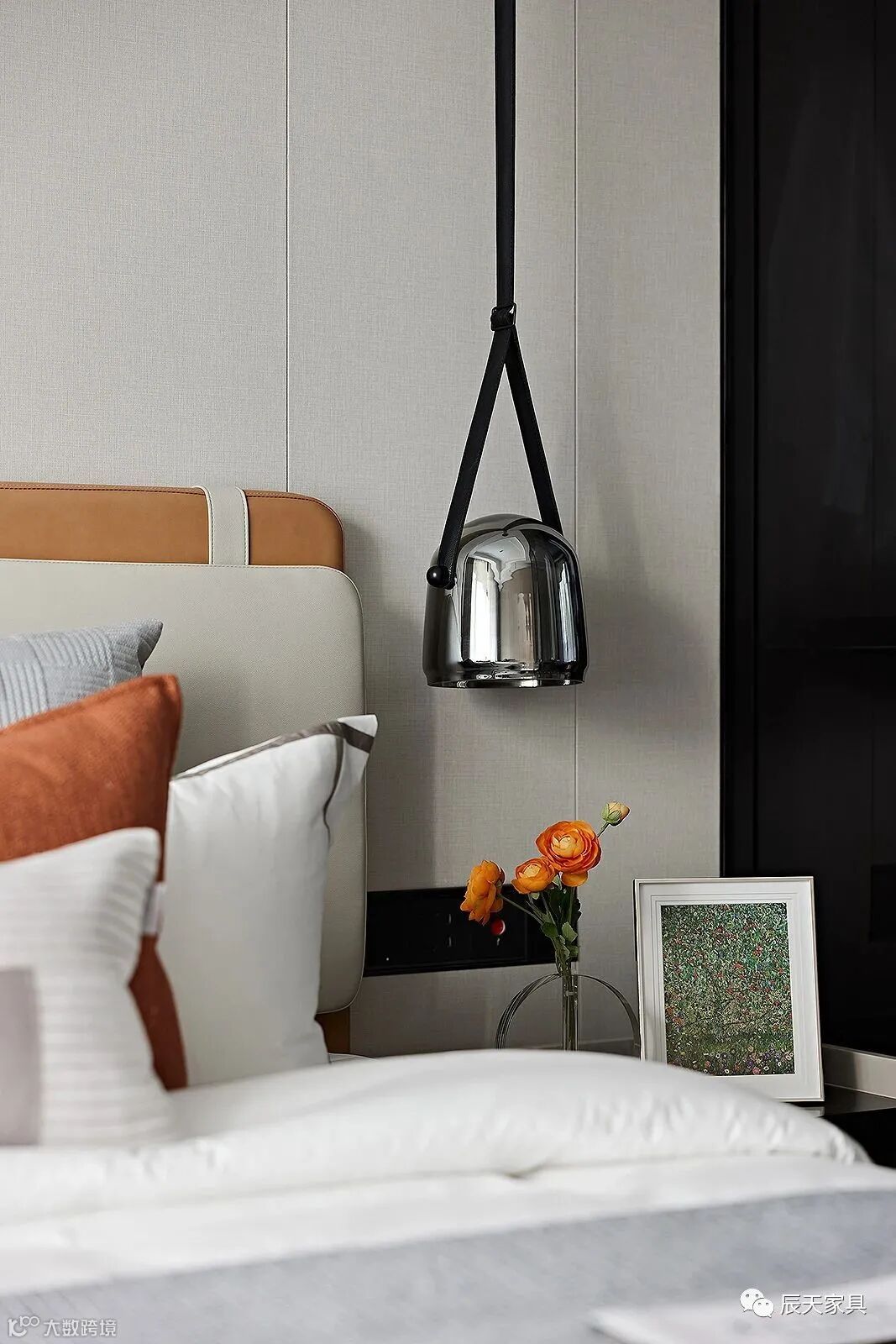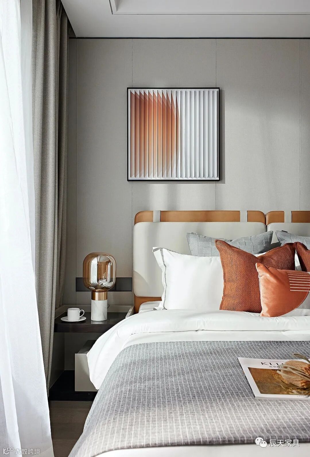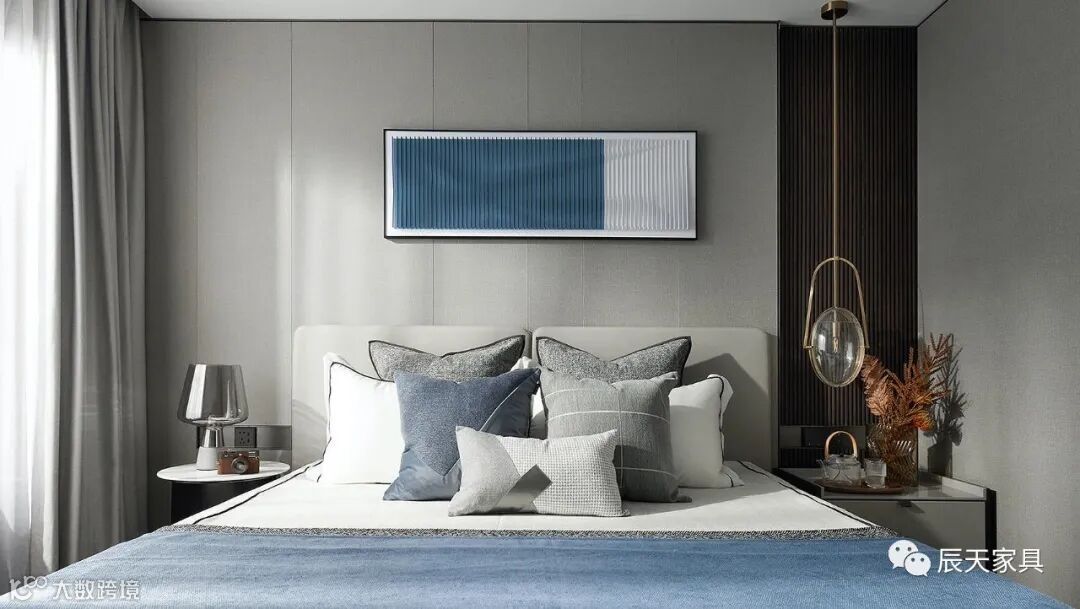 延续整体的色彩与风格基调,设计师赋予主卧空间灵动轻盈的观感。在雅灰的铺叙下,暖橘色彩的渲染,象征着生活的热情与活力,唤起人们心中对于美好生活的期许。