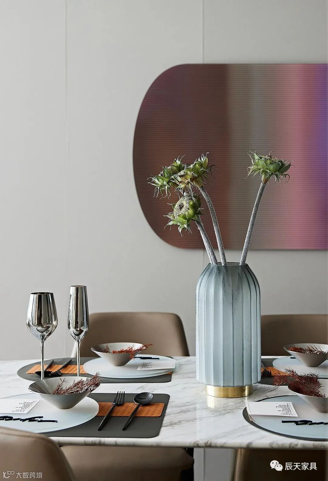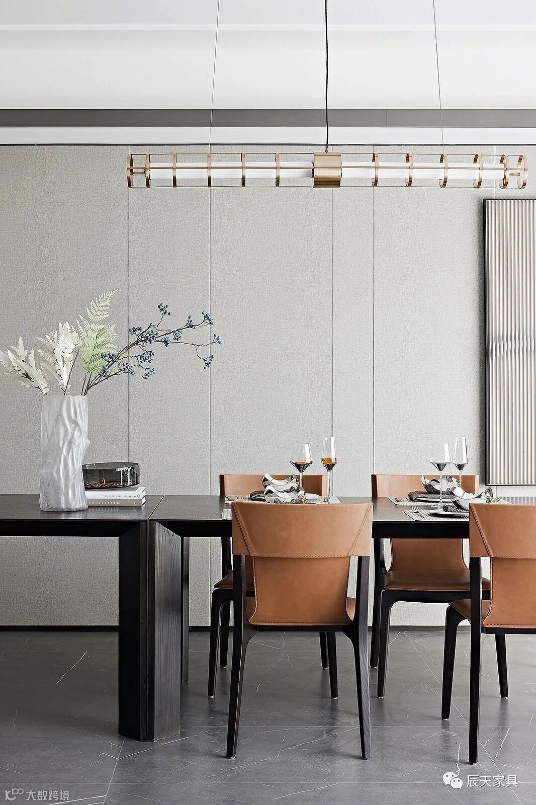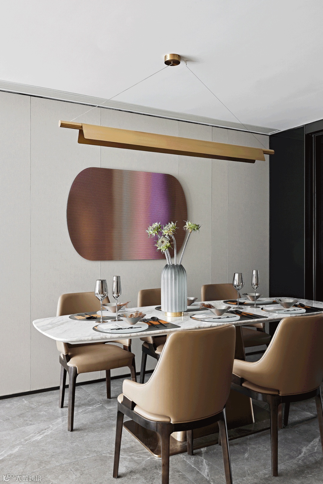 步入开放式餐厅,造型别致的金属线性吊灯,搭配同色系的餐椅,强化了就餐空间的整体感与仪式感。当视线过渡至墙面,一幅色彩纷呈的挂画,作为整体中独特的一笔,极具视觉活跃度,不经意间唤醒并点亮了空间。