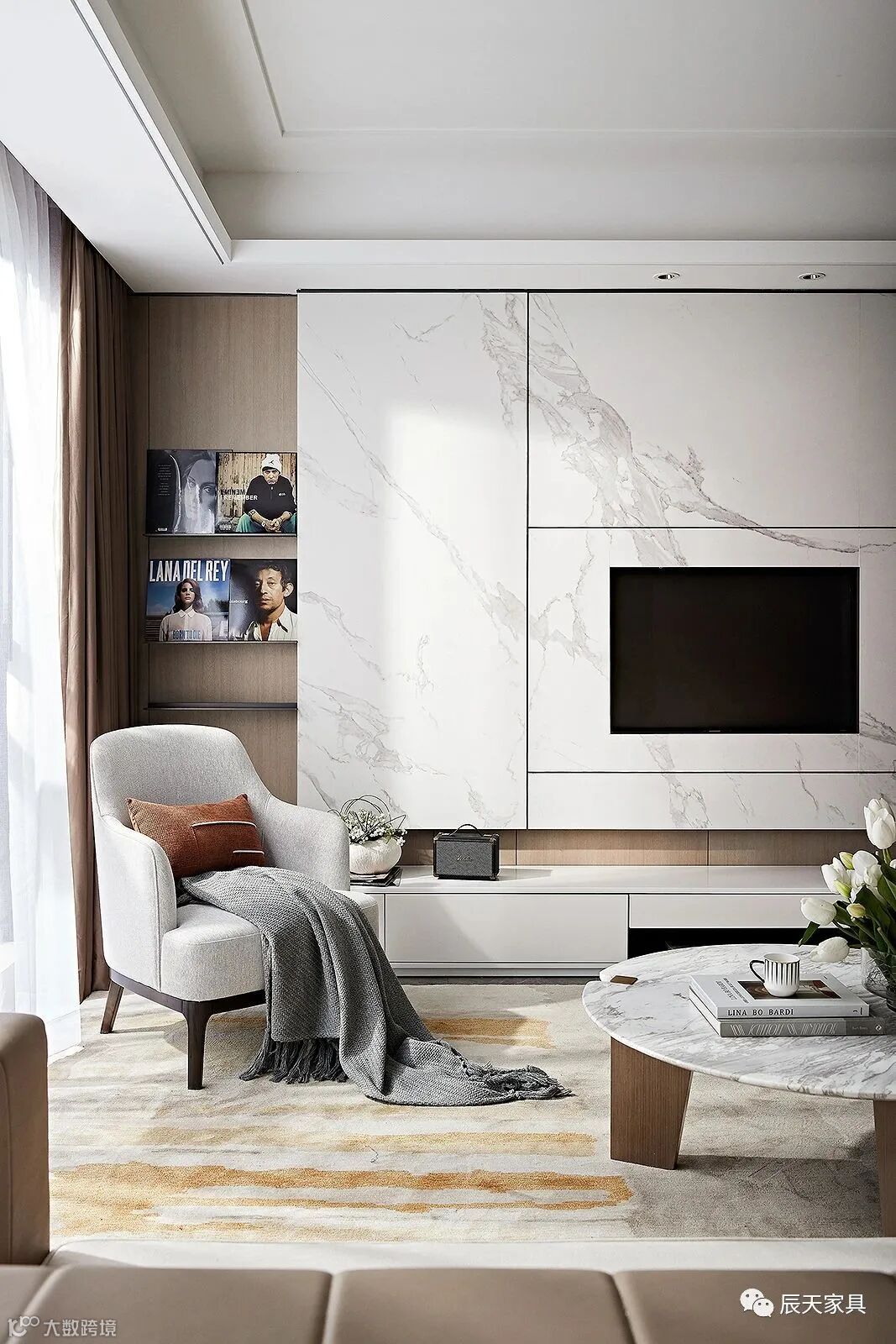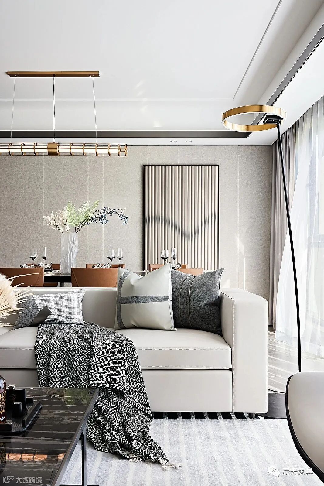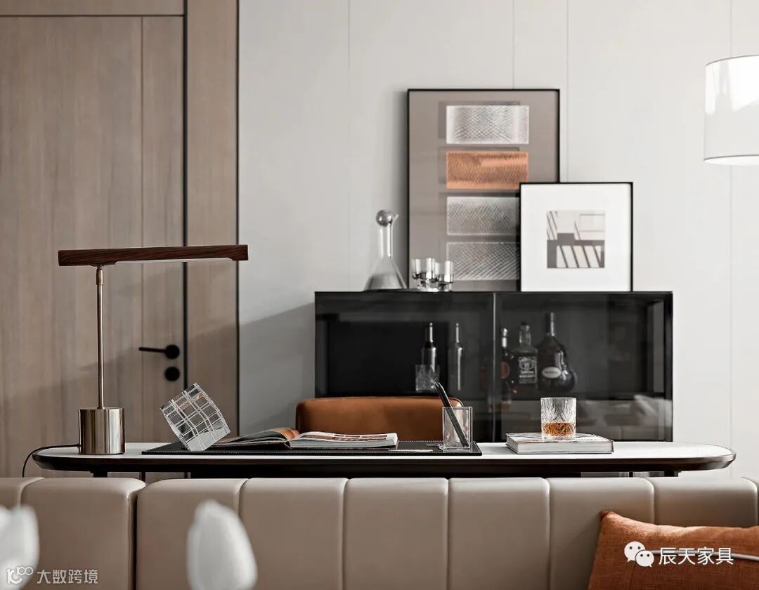 步入客厅,入目是一派意式高级简奢的氛围。设计以咖棕、米色、雅黑的色彩组合,布局空间的美学秩序。透亮简静的台桌、台灯的金属弧线、地毯的几何条纹......在阔绰的自然光影下,形成自然与艺术的对话,质感高级,亦不失生活的情调。