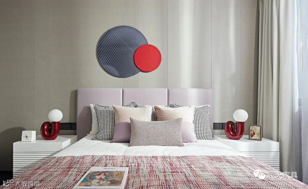 香芋紫、正红、烟粉等浪漫的色系绽放于空间中,在视觉感官层面,将女儿房浪漫天真的空间性格温柔地延展开来,营造出一个甜美温馨的空间。