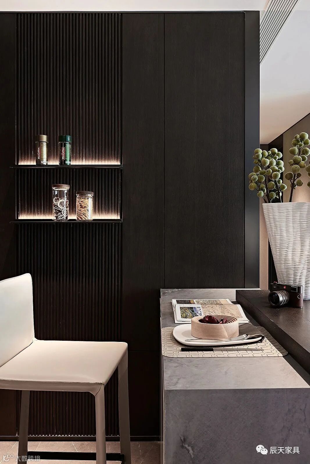 另一侧的半开放中岛吧台区域,安放着一张现代感的白色单椅与清新的绿色盆栽,完美演绎着都市生活的情景写照。居者可以在此看书、饮茶或者冥想,静享平凡日常中的缝隙时光。