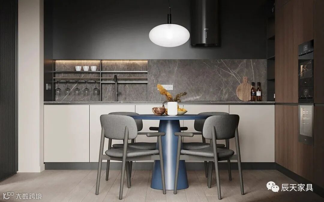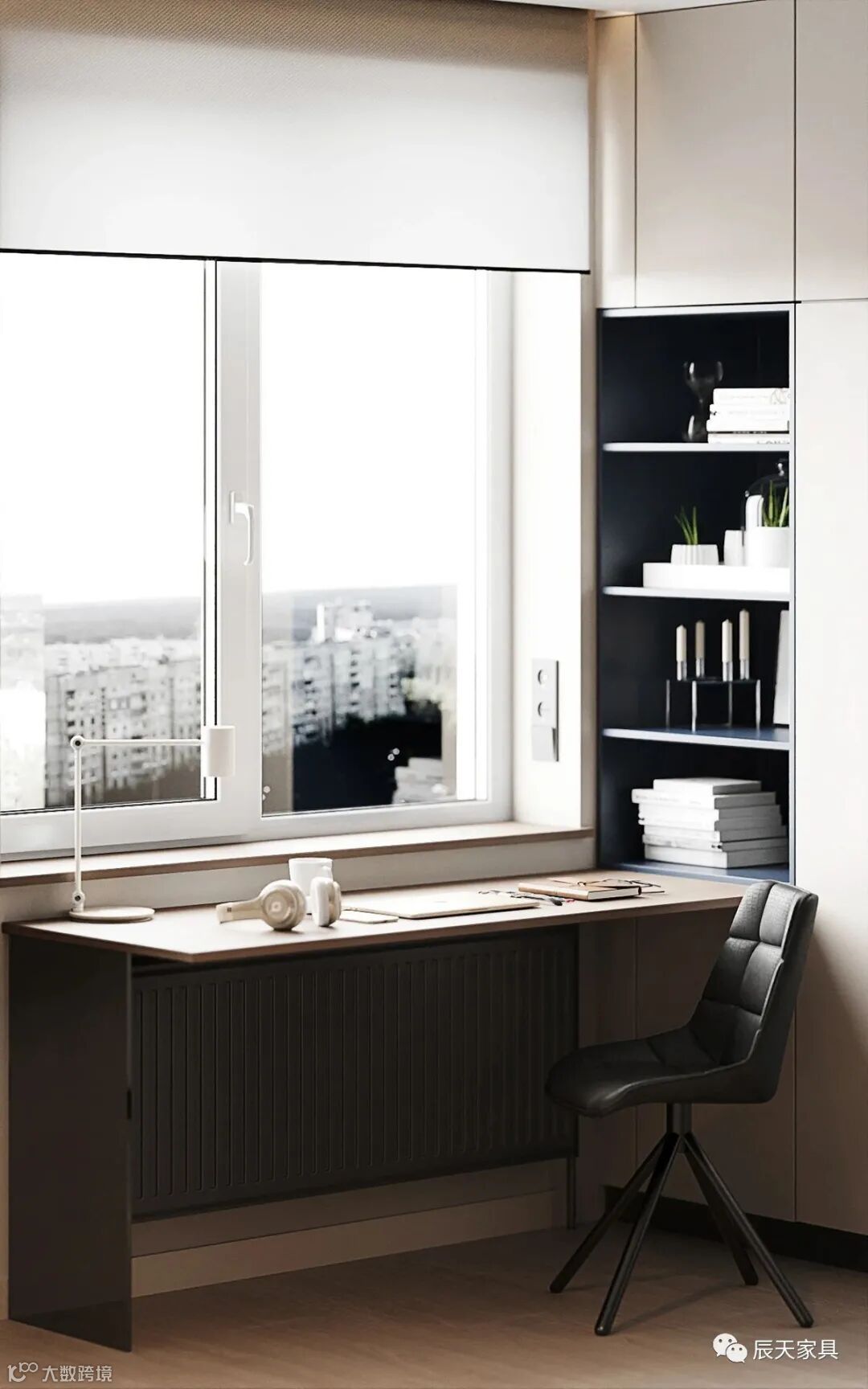 灿烂和煦的阳光洒进屋里,铺满放在窗前的写字台上,在这里使你静心看书学习。厨房位于客厅一侧,栅栏隔开,灰色大理石纹,木色的厨柜,黑灰色的背景,蓝色的餐桌,木色地板,任何细节的斟酌都会带来质感的回馈,对生活的要求,多么精细也不为过。