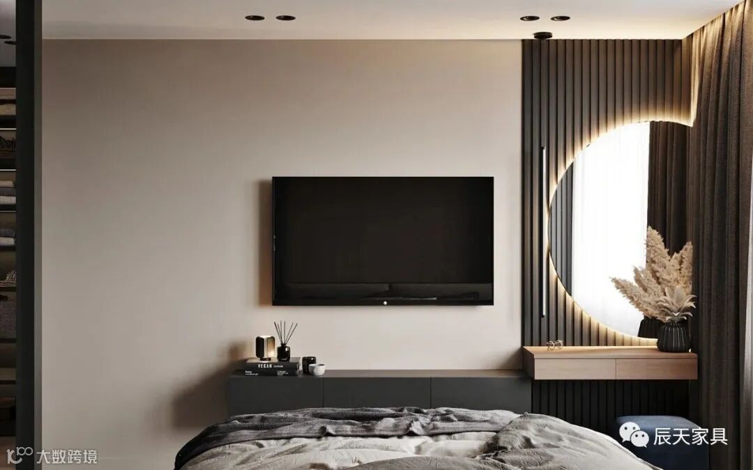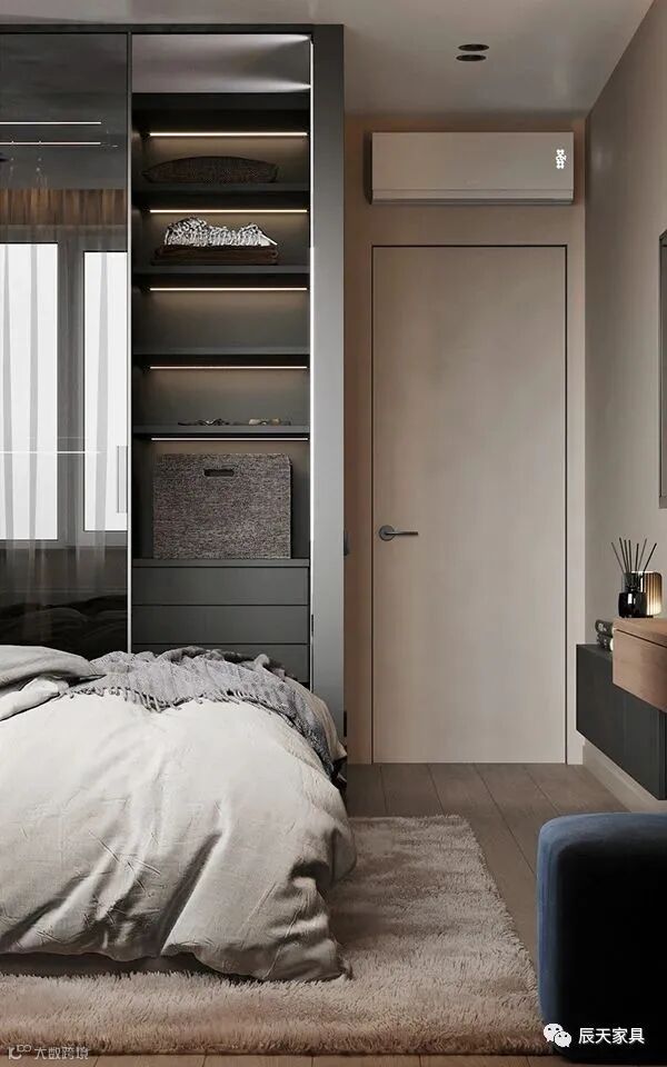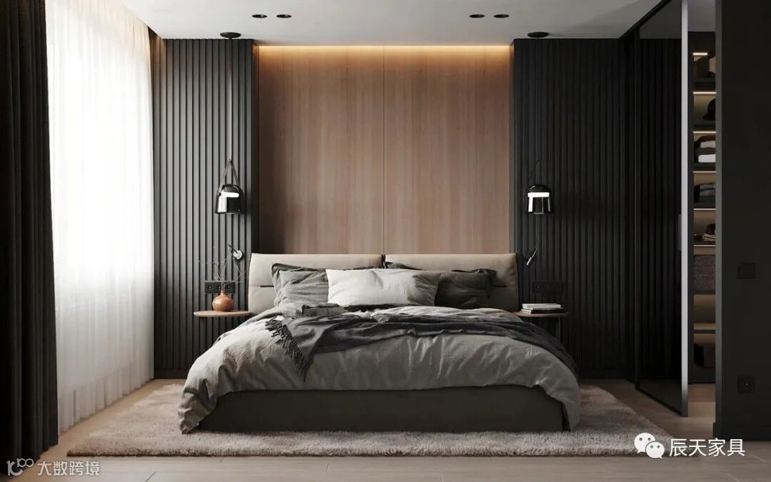设计师在卧室采用木色和黑色的色彩对比法,以干净纯粹的白色,搭配浓郁深沉黑色和木色,使空间彰显出低调张弛的典雅;同样的,卧室也没有设计主灯,点光源放大了对比层次,让休憩氛围愈加静谧安宁。