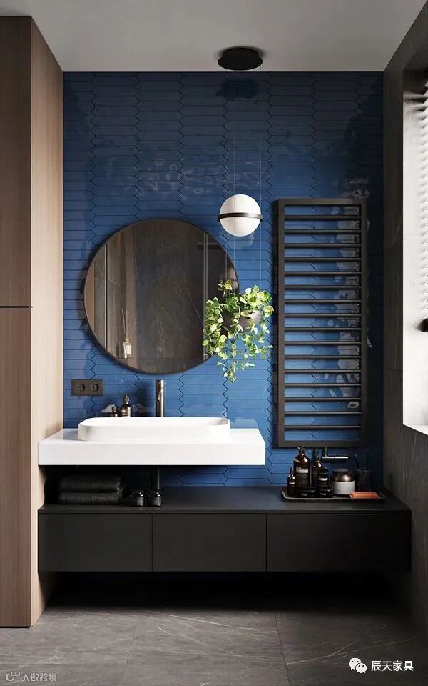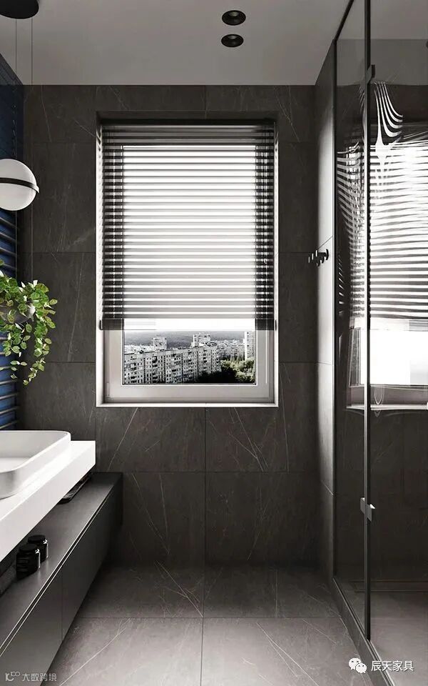 卫生间采用高级灰+蓝色,和客厅色调相搭配,干湿分离。