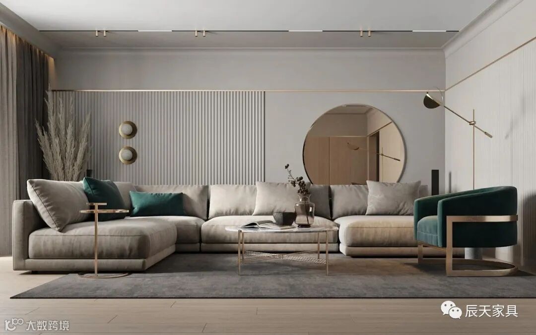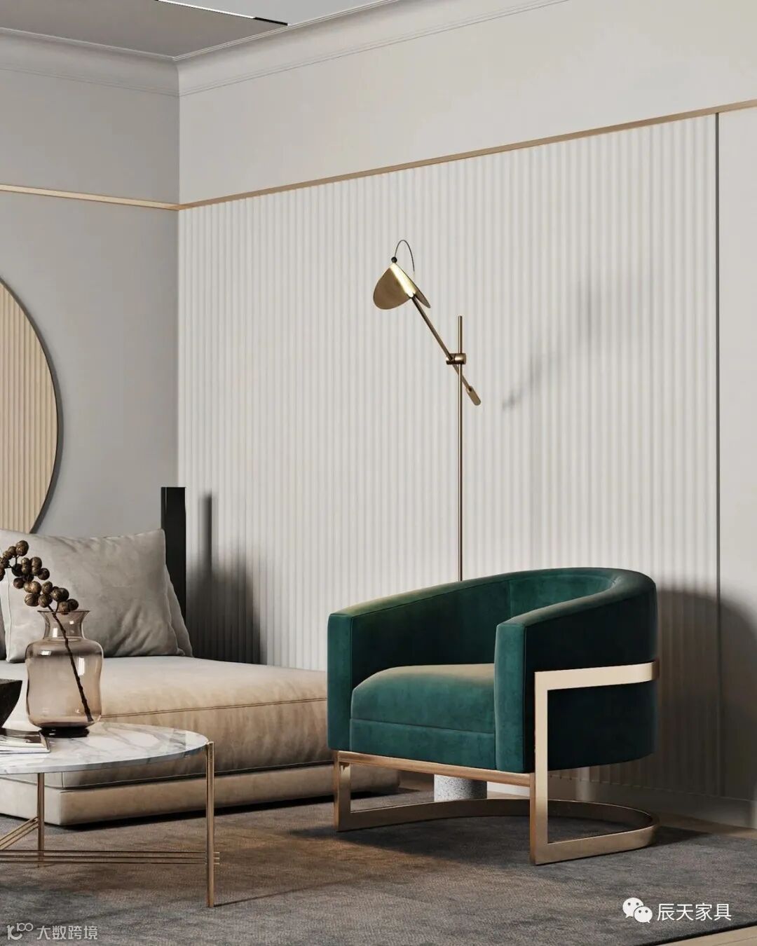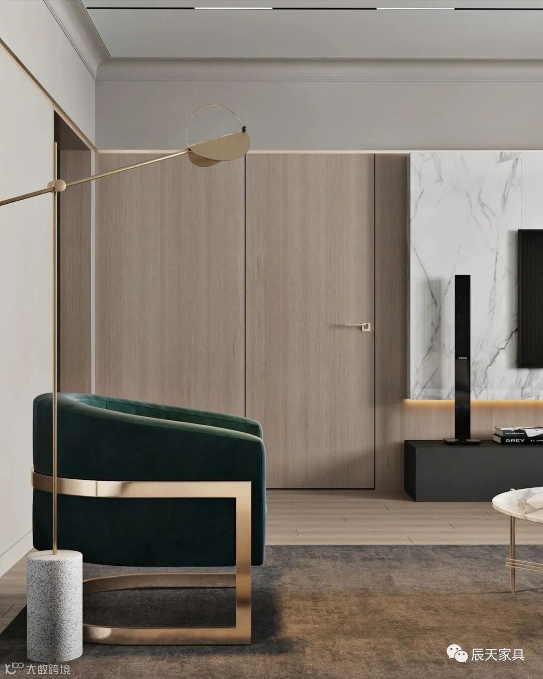 这套私人住宅项目,一种饱和度低、纯度低、质感和谐而自然的中性色调,设计师将黄铜搭配在一起,营造了优雅沉稳的家居气质,而明亮的绿色调作为点缀出现,两者很好的融合在一起,带来古典田园的感受。
