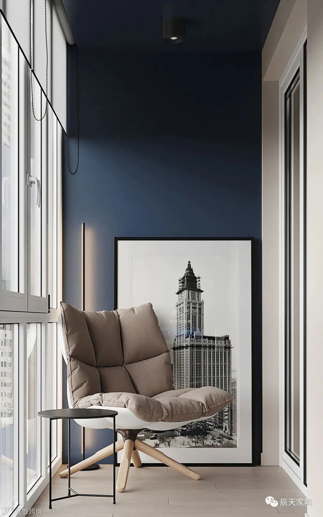 封闭式阳台,这里设置了一个工作室和休闲空间,以蓝色为背景,整体风格色调与客厅相协调,简约的茶几、让自己除了工作之外还有生活。