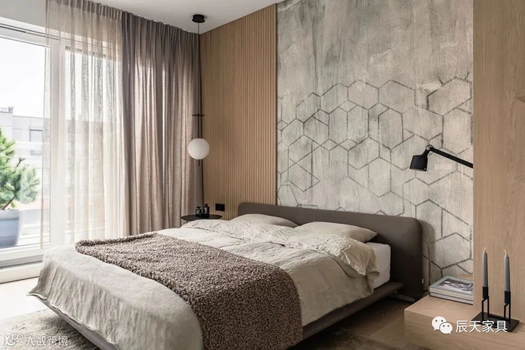 大面积的灰色和木色运用,营造出卧室的静敛氛围,并为安静的休憩提供了保障。