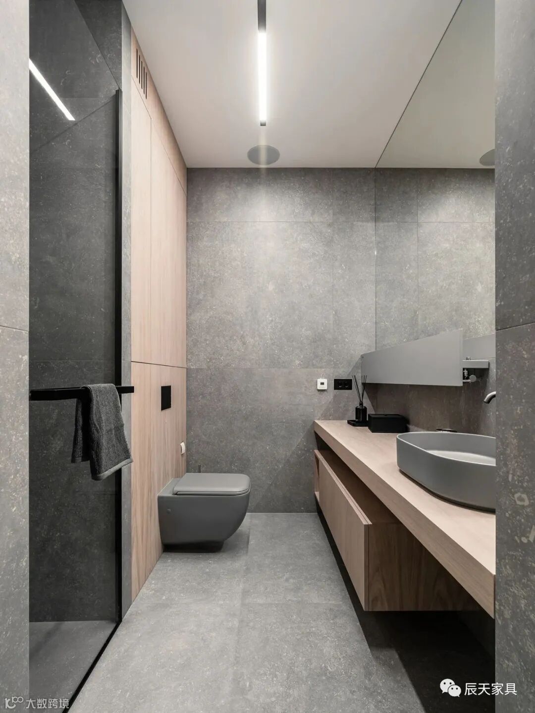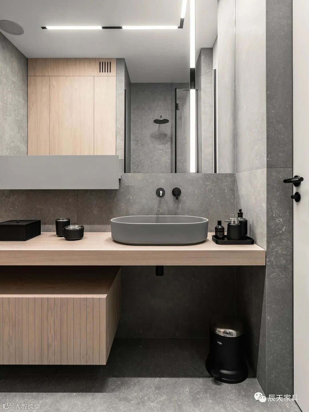 主卫以高级灰搭配木色为主,营造出时尚高端的家居氛围,经过设计师精心组合搭配的浴室家具,提升了浴室的精致感和舒适度。