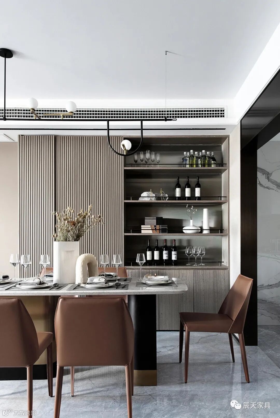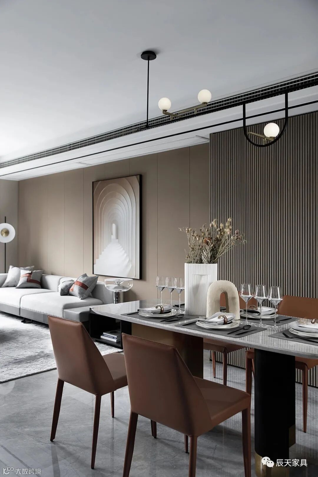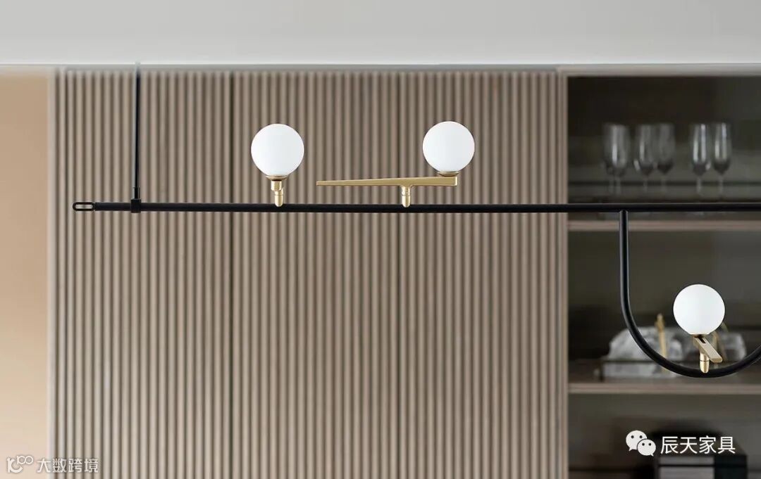 餐厅中富有肌理感的大理石与木质的沉稳低调形成对比,点点光影在几何吊灯中回溯交错,橙色的皮质餐椅更加夺目耀眼,灰白色调对比的西厨空间显得更加宁静,简洁干练的线条,这一切赋予了生活最灵动温馨的样子。