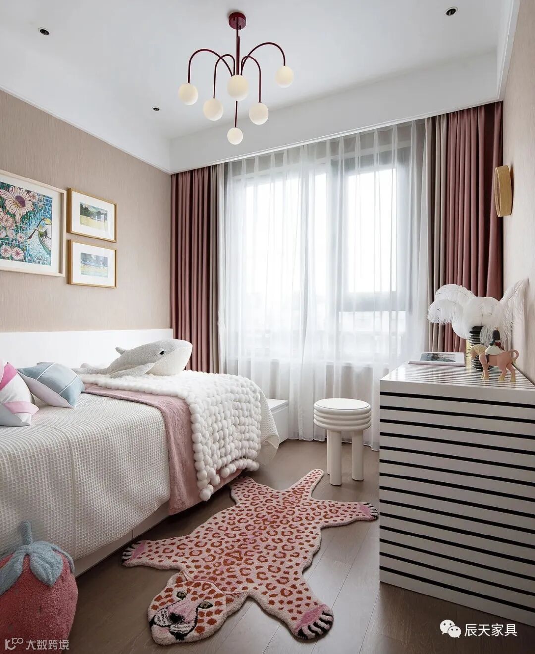 儿童房打造了一个充满童趣的世界,整个房间色调清新明快,灵动的装饰画、动物地毯、可爱的玩偶,营造了一个干净整洁的氛围,快乐而轻松。