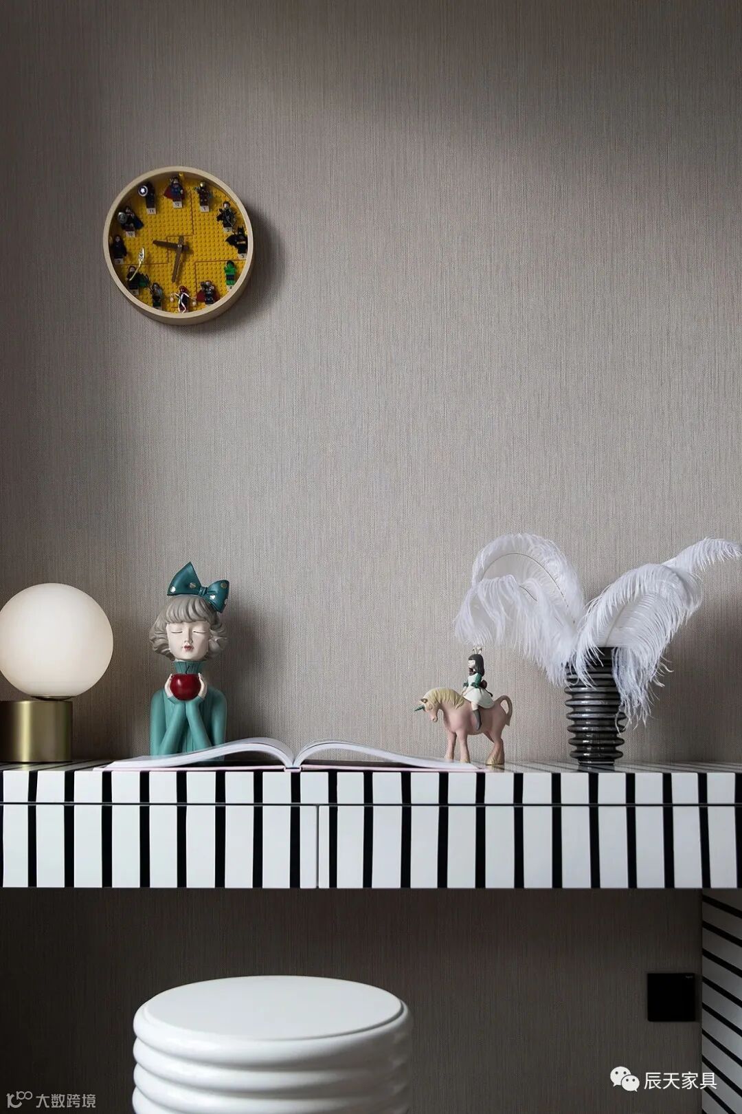 用大自然做美学,去实现人与环境美好的互动关系,用借景来增加空间与空间关联性,配合金属材质,用恰到好处的软装使整个空间看起来干净利落。这里是儿童的玩耍区域,也是主人办公休闲的区域,超大的原木桌面,墙面的装饰,通透宽敞的区域可以小憩,电子琴,天文望远镜,小汽车,无不彰显出家庭和谐的氛围与良好的亲子互动关系。
