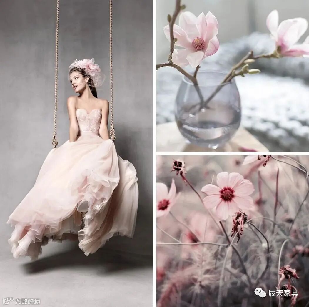 高级灰高贵优雅,低调知性。柔美的粉色闯入灰色的世界,为其注入柔情。高级灰与粉色共舞,旋转着交融,化作浪漫的风景线,优雅又温柔。
