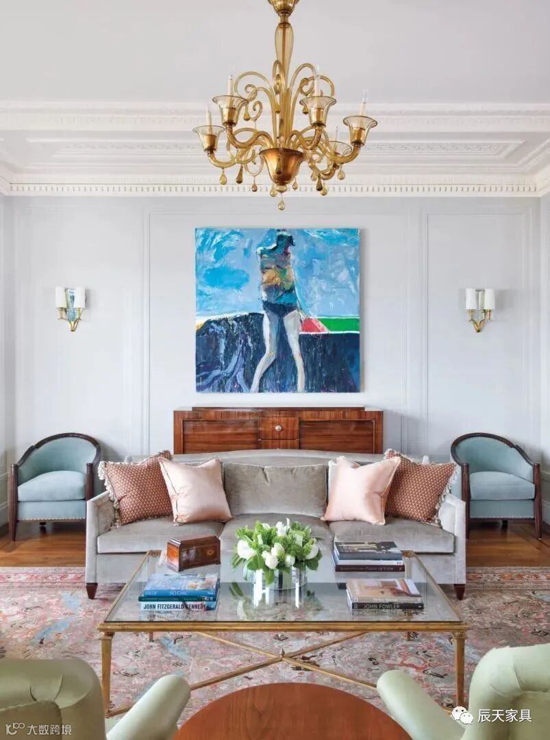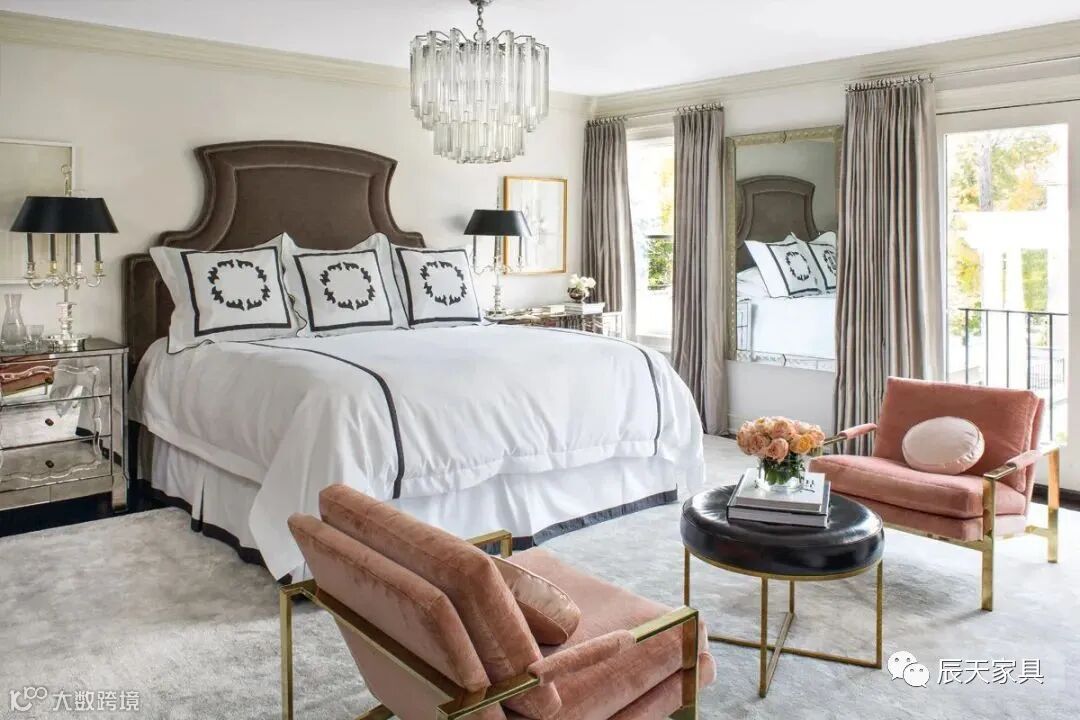 灰与粉搭配展现着年轻姿态与优雅格调,不限性别和时节。即使出现在卧室中,也可加入粉色的调和,只要注重粉色的比例即可。就像这套案例,以一对暗粉色休闲沙发打破黑白灰空间的沉静氛围,带入柔性特质与浪漫气息。配搭着华丽的现代材质,打造出时尚造型,为简单的休息空间注入着丰富的内涵情韵。同时复古的Venini枝形吊灯,更增添了优雅的气质。