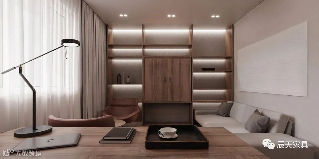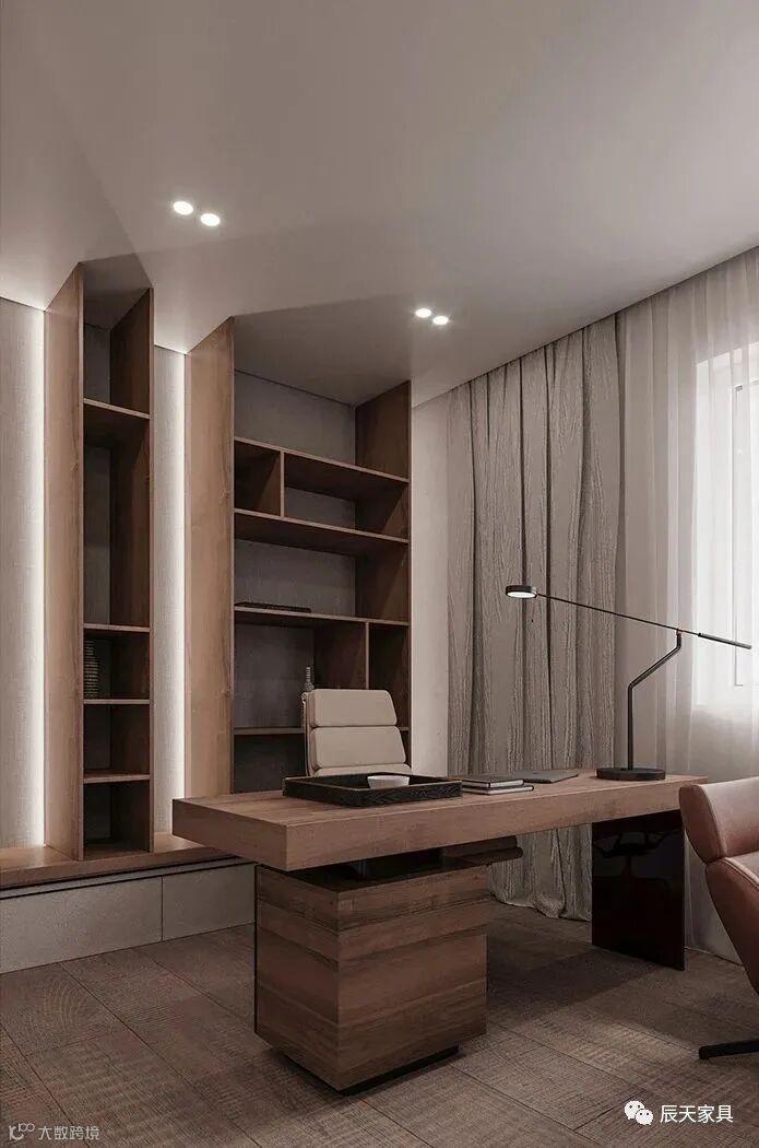 书房纵横交织着硬朗与柔软,粗糙与细腻,材质间的对垒使得整个空间扑面而来一股高级的气息。