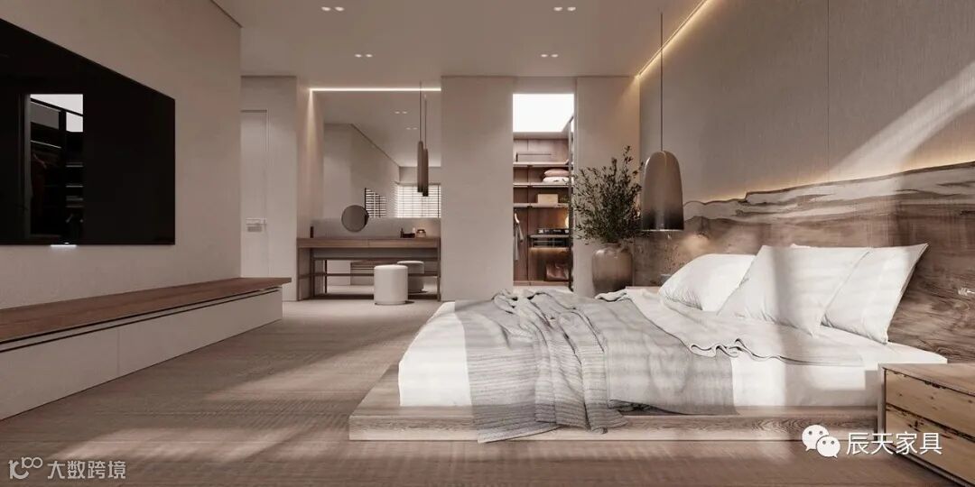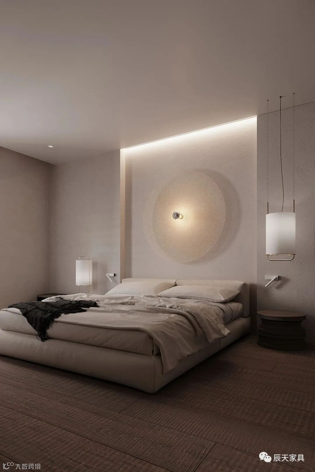 在主卧里,自然光和人工照明把光源利用到极致,在这里,艺术与功能并不矛盾,舒适温馨、大气简约,尽情释放着侘寂独有的质朴魅力。