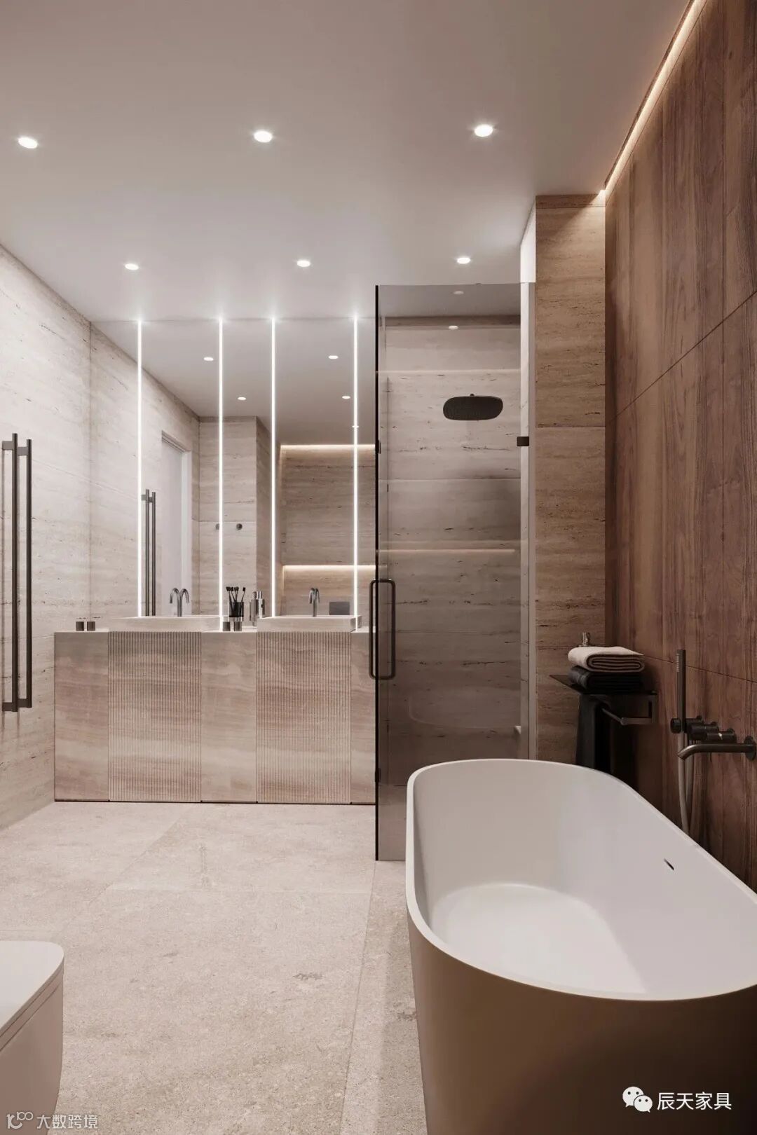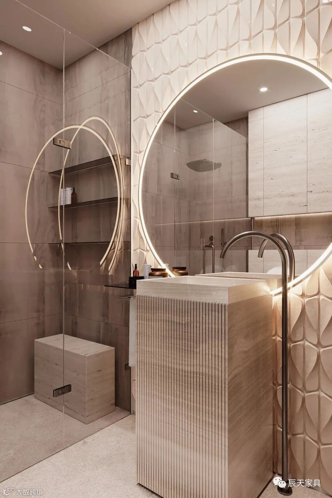 没有过多的装饰是这卫生间的主要特点之一,巧妙搭配自然质感的石材以及灯光元素,赋予空间生动的魅力。