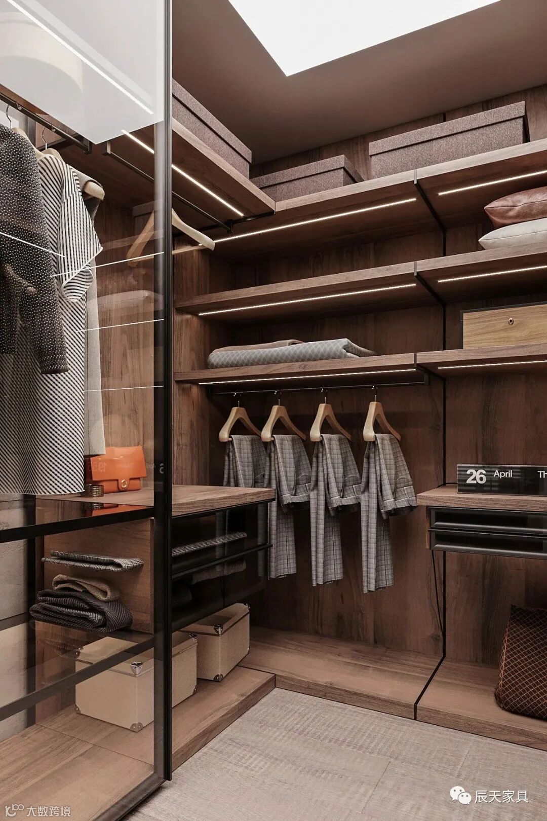 步入式衣帽间时尚前卫,不需要打开所有的壁橱,去找一样特定的东西,只要走进房间就能看到。这样的设计不仅在功能上带来了便利,在视觉上也显得简洁通透。