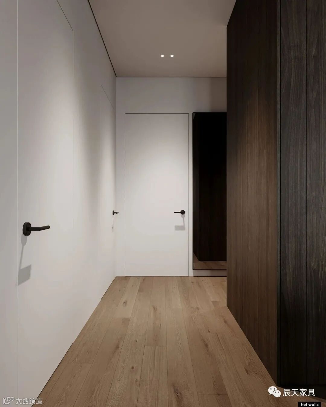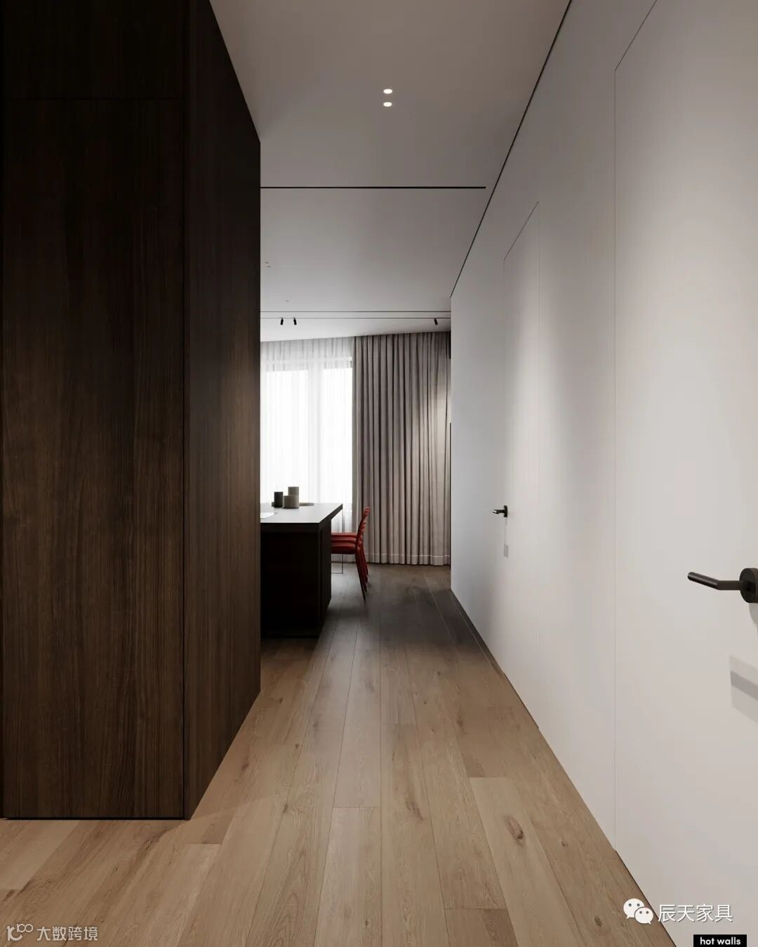 一个好的空间是能够感动人的,让居住者受到触动。空间中大量运用深色天然木纹饰面,木材的温润结合白色和灰色,不失温柔。