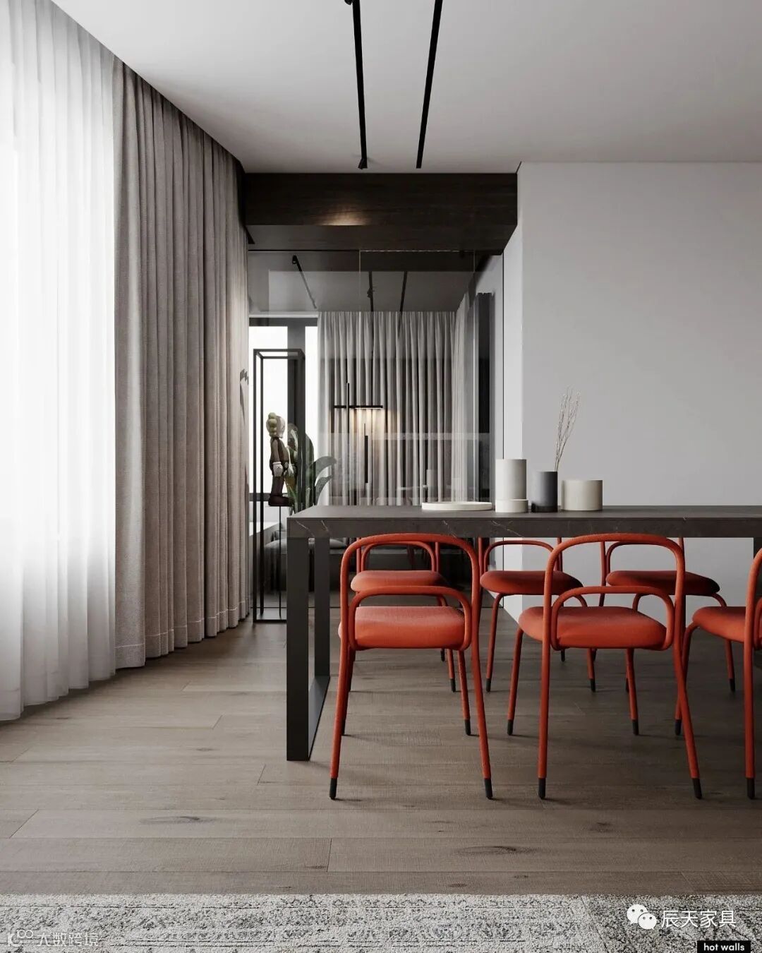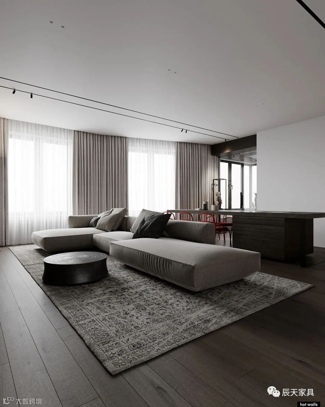黑,白,灰,是整个客厅的材质用色,比较内敛,沉静。沉稳温丽的色调下,线条利落有致,格局清晰,结构性强,空间质感不言而喻。