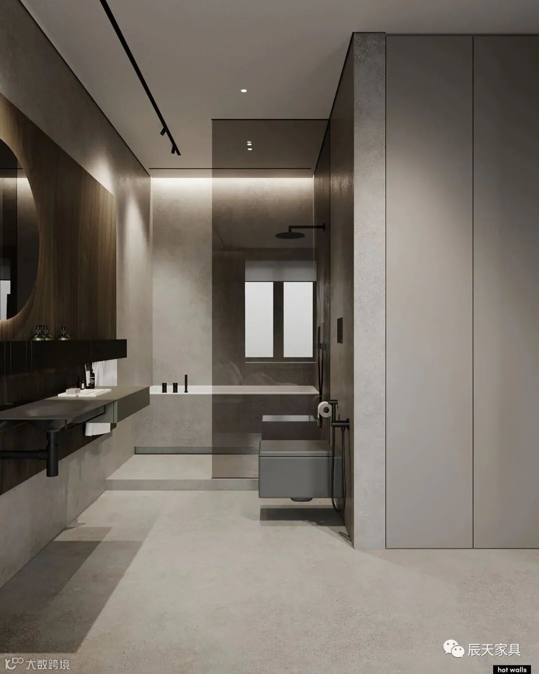 卫生间采用水泥灰为主,自然简洁的质感,浴缸,精致的洗漱台,不仅彰显了一种美好、精致的生活态度,还透露出不俗的生活品味。