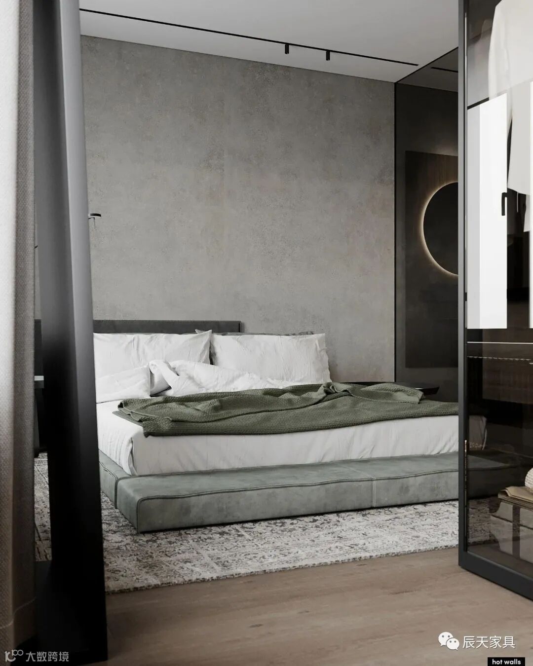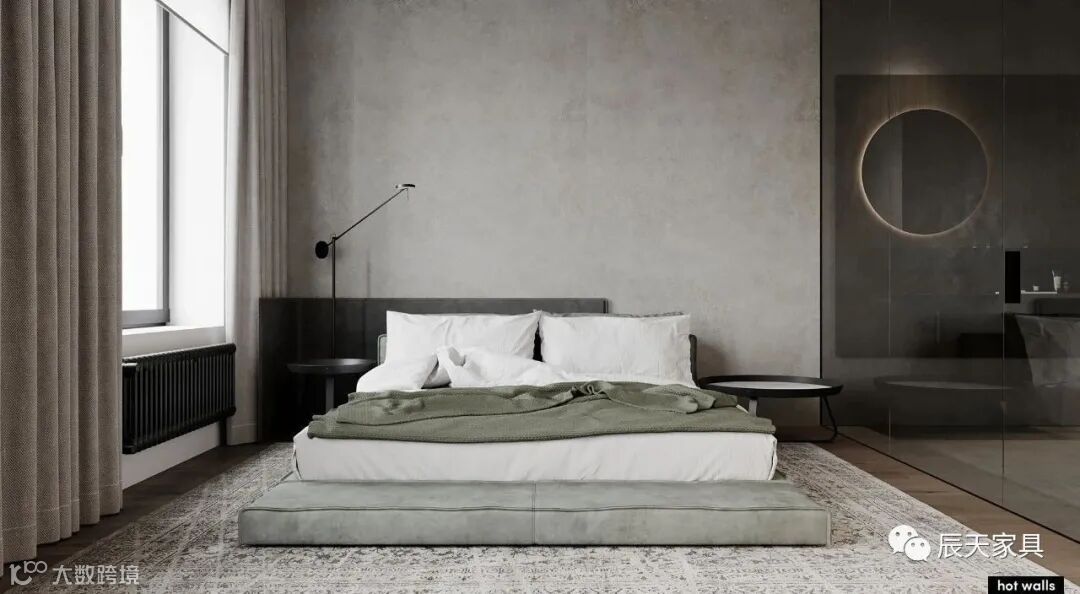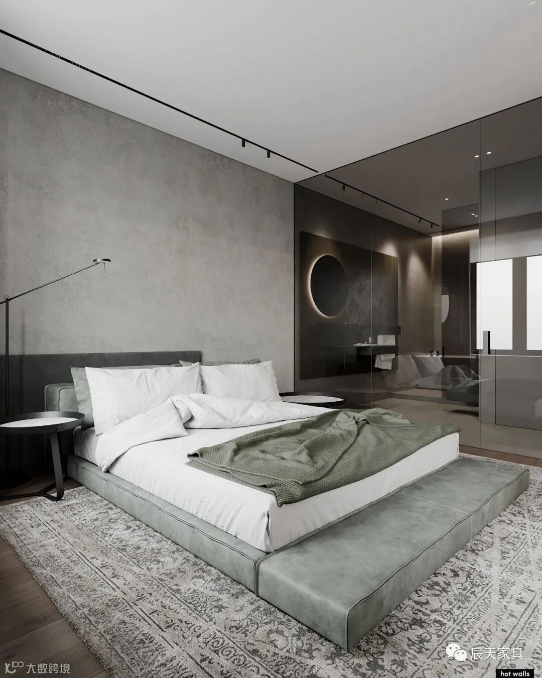 卧室的空间,用了浅绿色,灰,木色色系,静谧,舒服。衣帽间在深色玻璃后方,浴室位于另一侧。