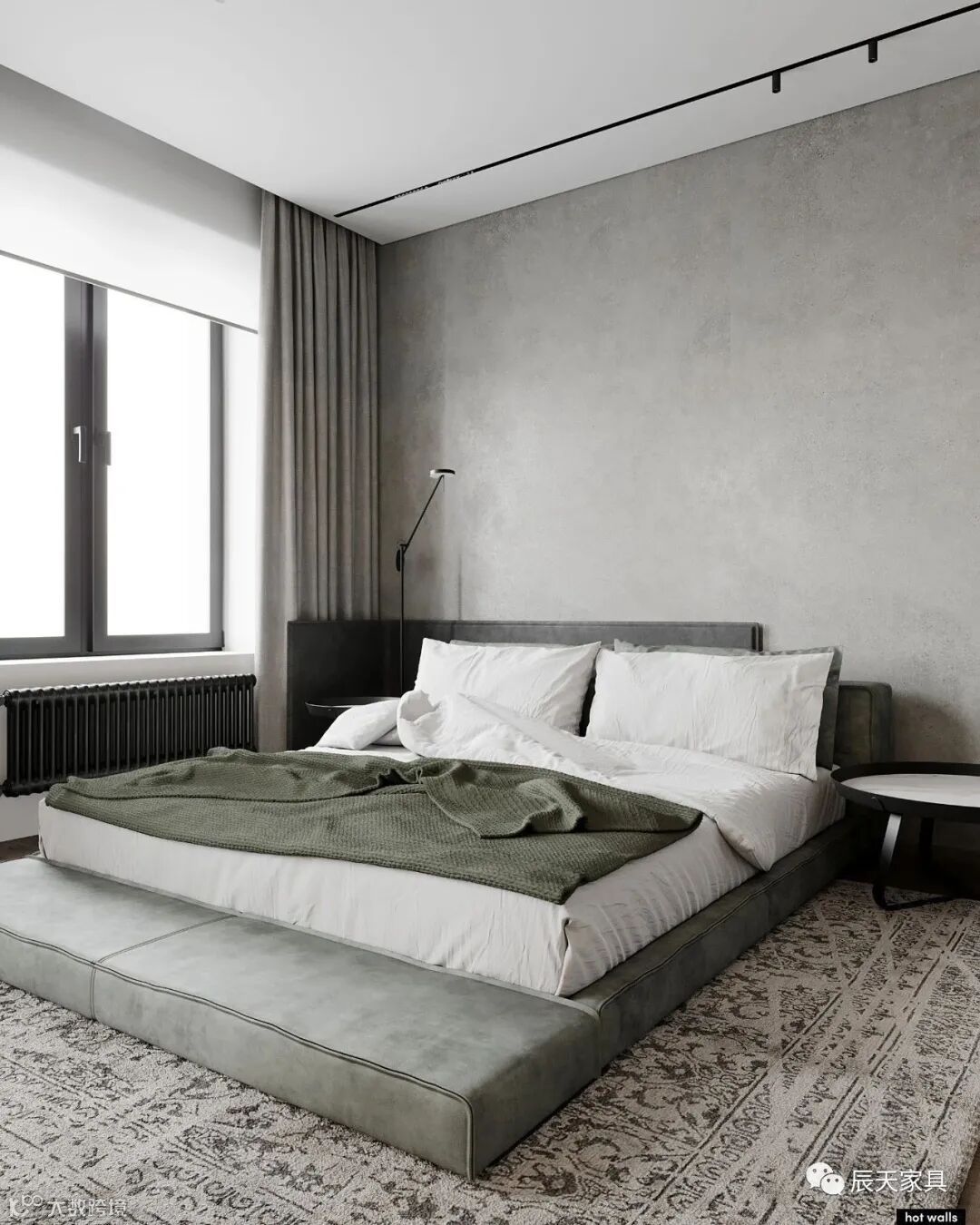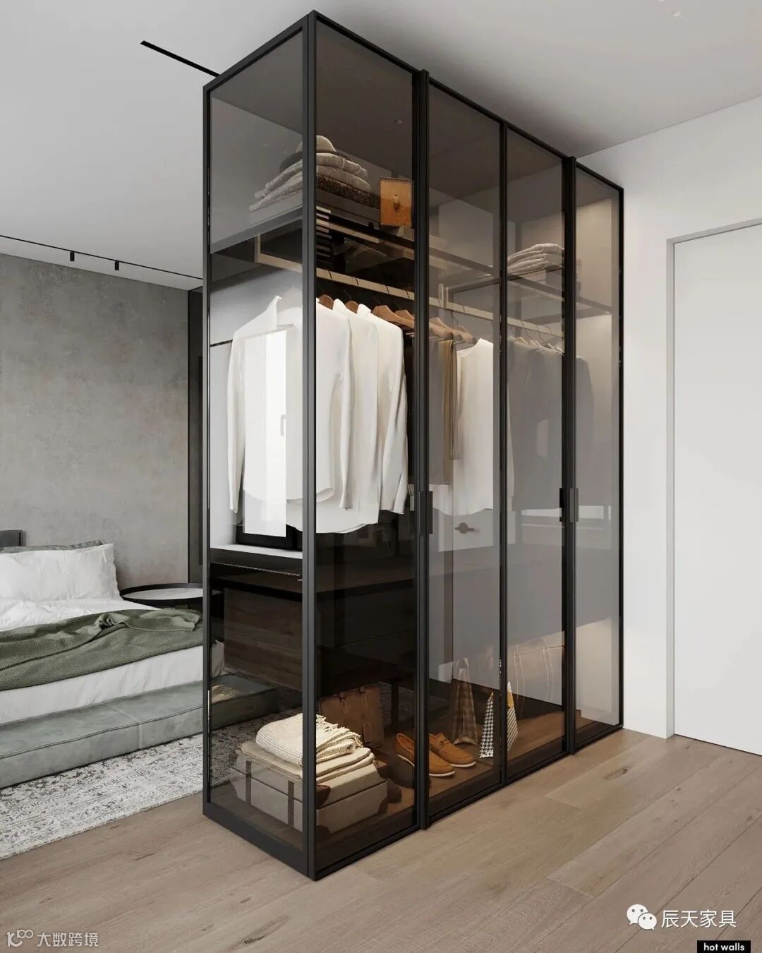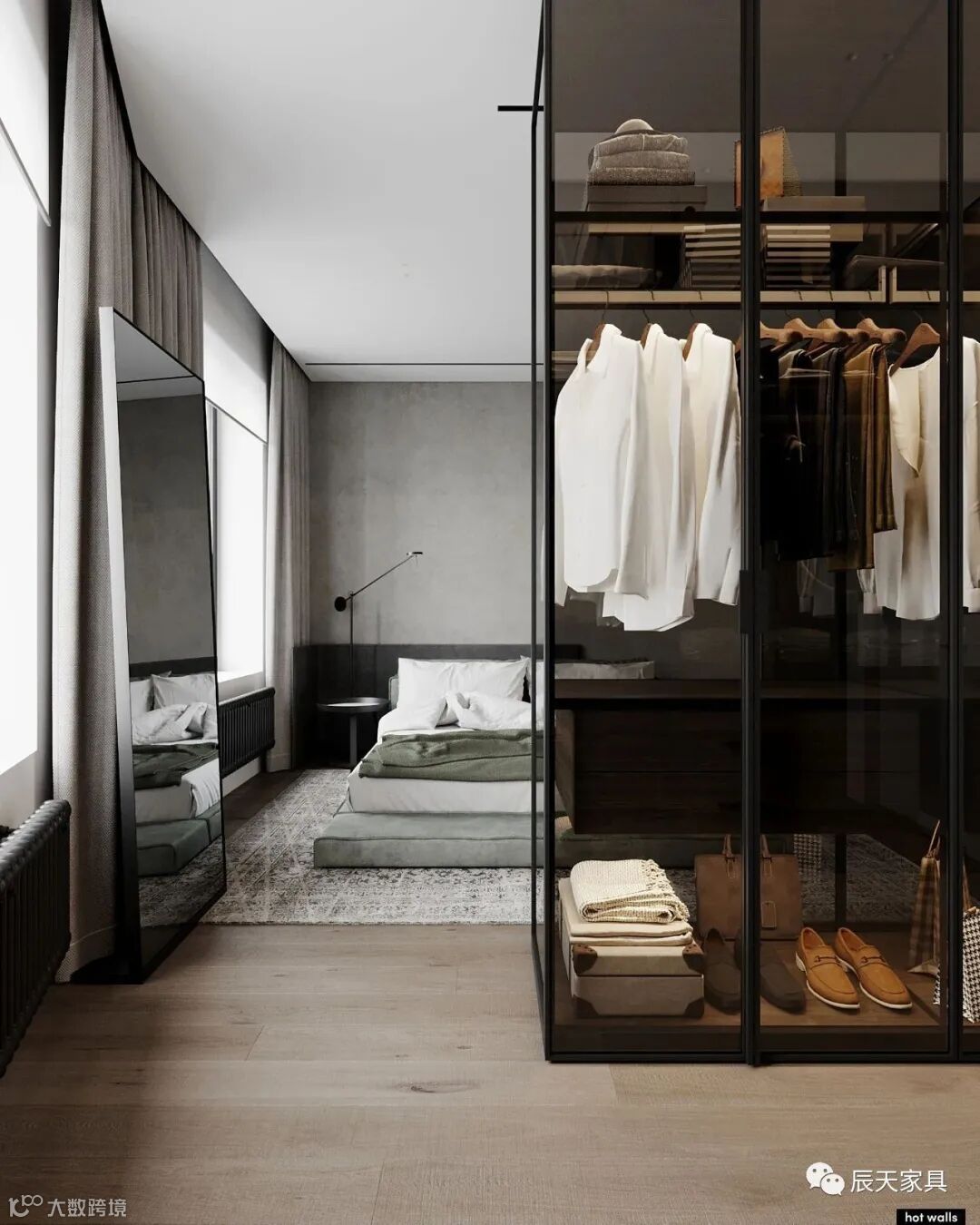 卧室的空间,用了浅绿色,灰,木色色系,静谧,舒服。衣帽间在深色玻璃后方,浴室位于另一侧。