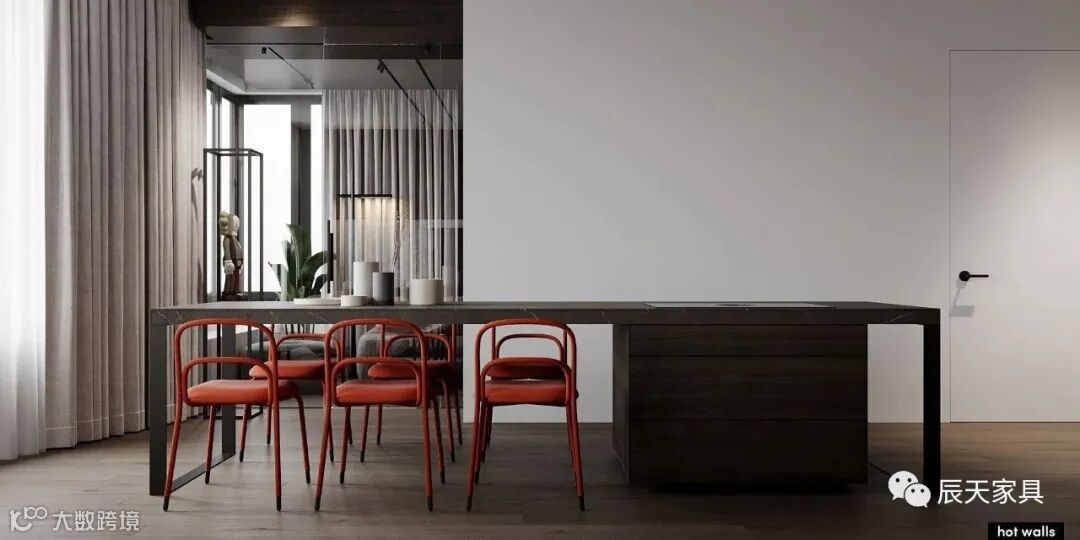 白色大理石电视背景墙,柔润的光泽使区域更为通透明亮。长长的岛台,它既是会餐的地方,也是休闲的绝佳选择,红色的餐椅比较抢眼。