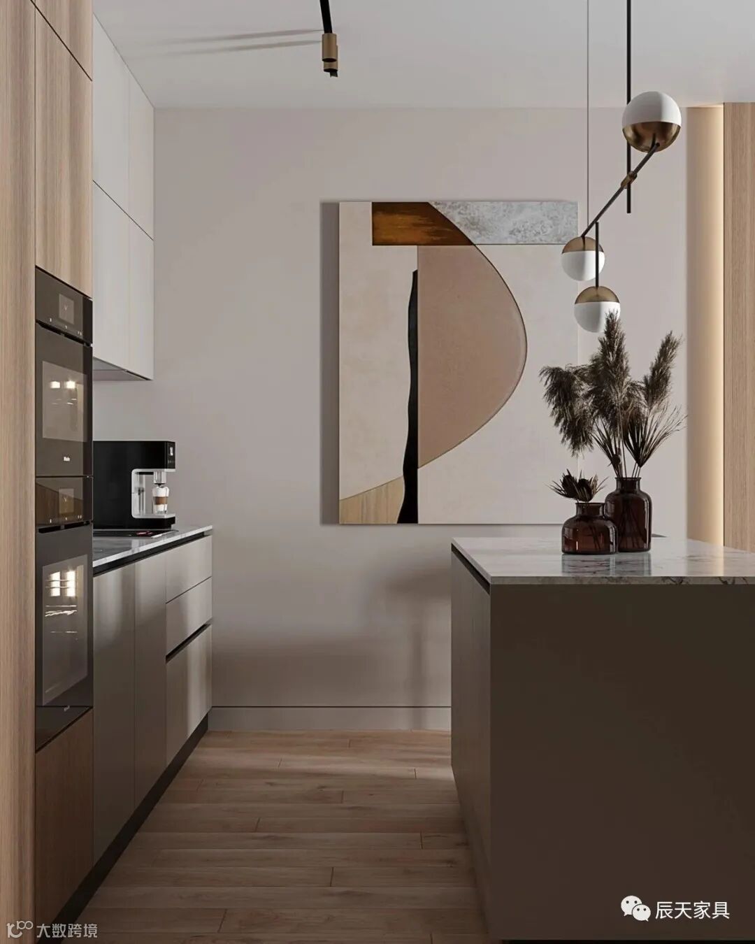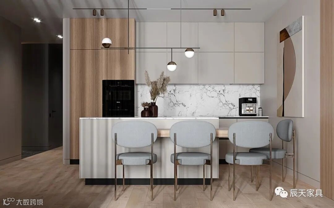 厨房设计成这样,不仅仅满足日常功能的需求,还让下厨变成了一种享受,厅与烹饪区连接在一起,既是吧台,也是隔断,大理石的台面在顶部的吊灯的渲染下,很贴合室内风格。