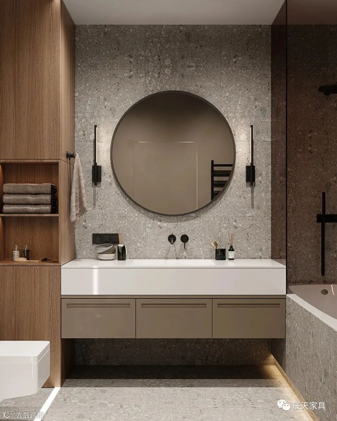 卫生间用水磨石铺设的地板和墙面,带有储物空间的简约洗漱台,可以放置毛巾、洗漱用品等等,镜子的运用也扩大了视觉空。